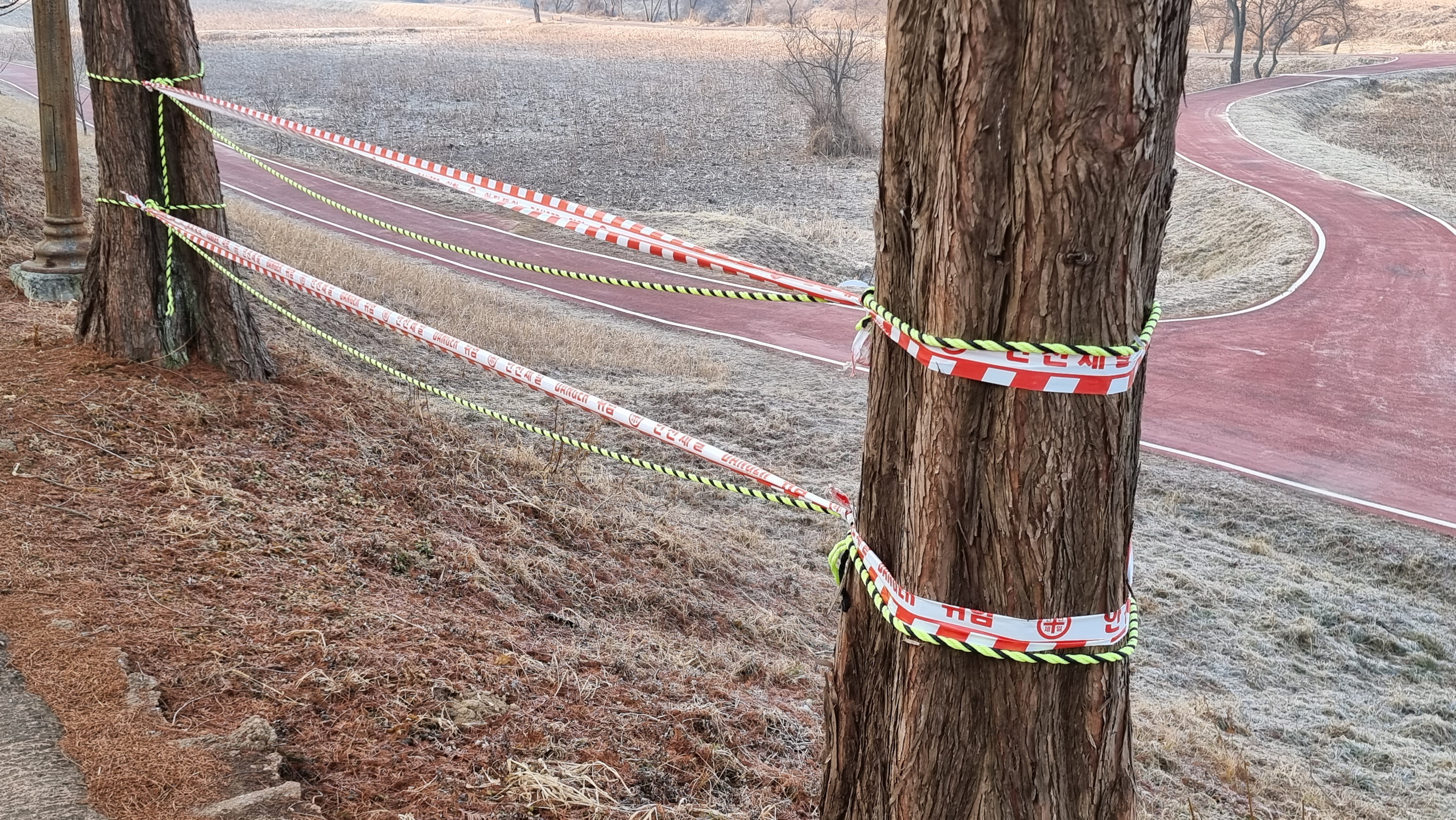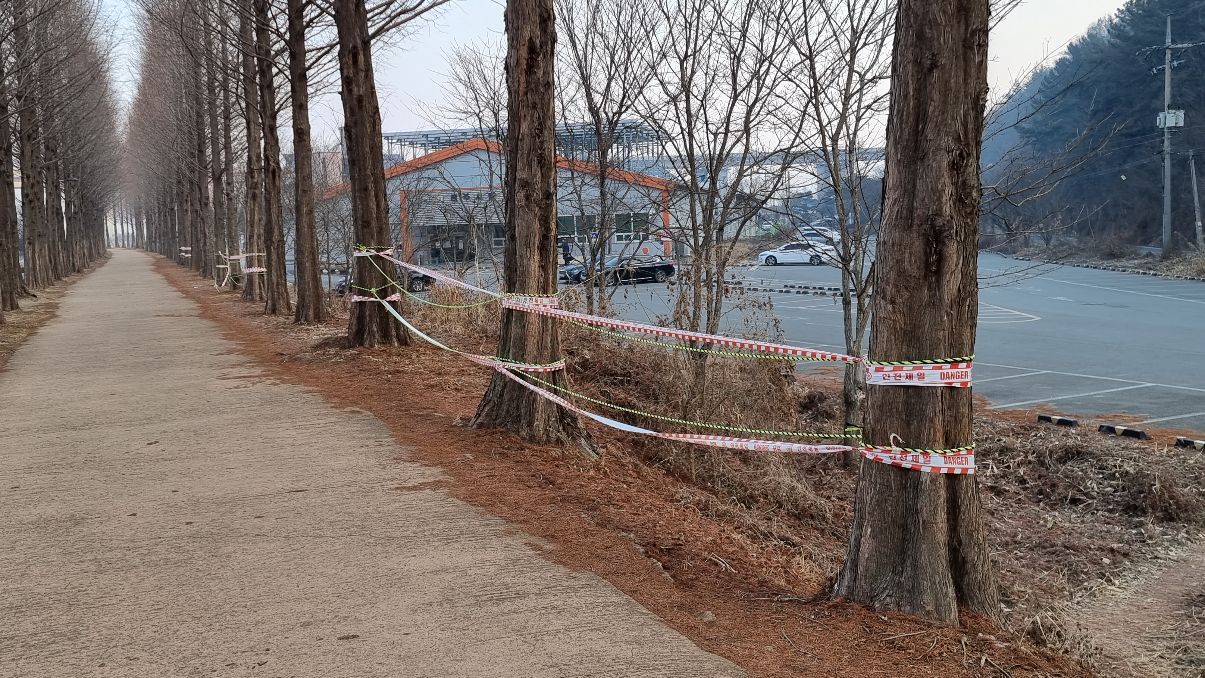 공주 정안천 생태공원의 메타세쿼이아 길에 보기 흉한 방지 줄
