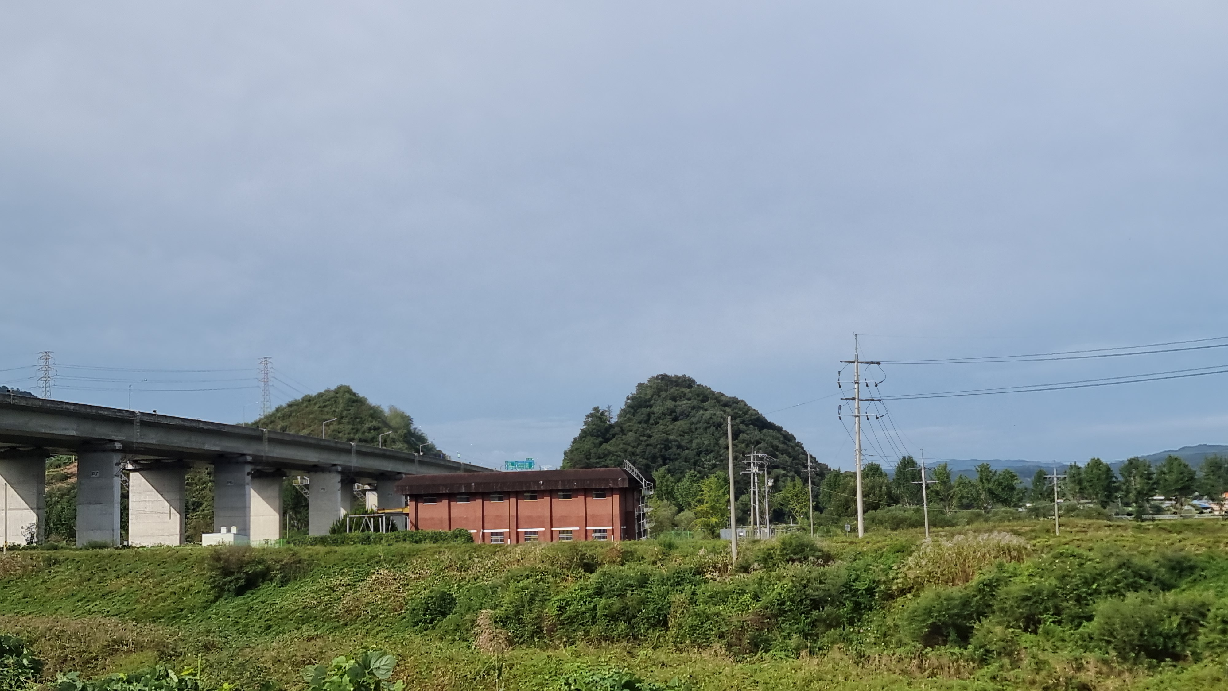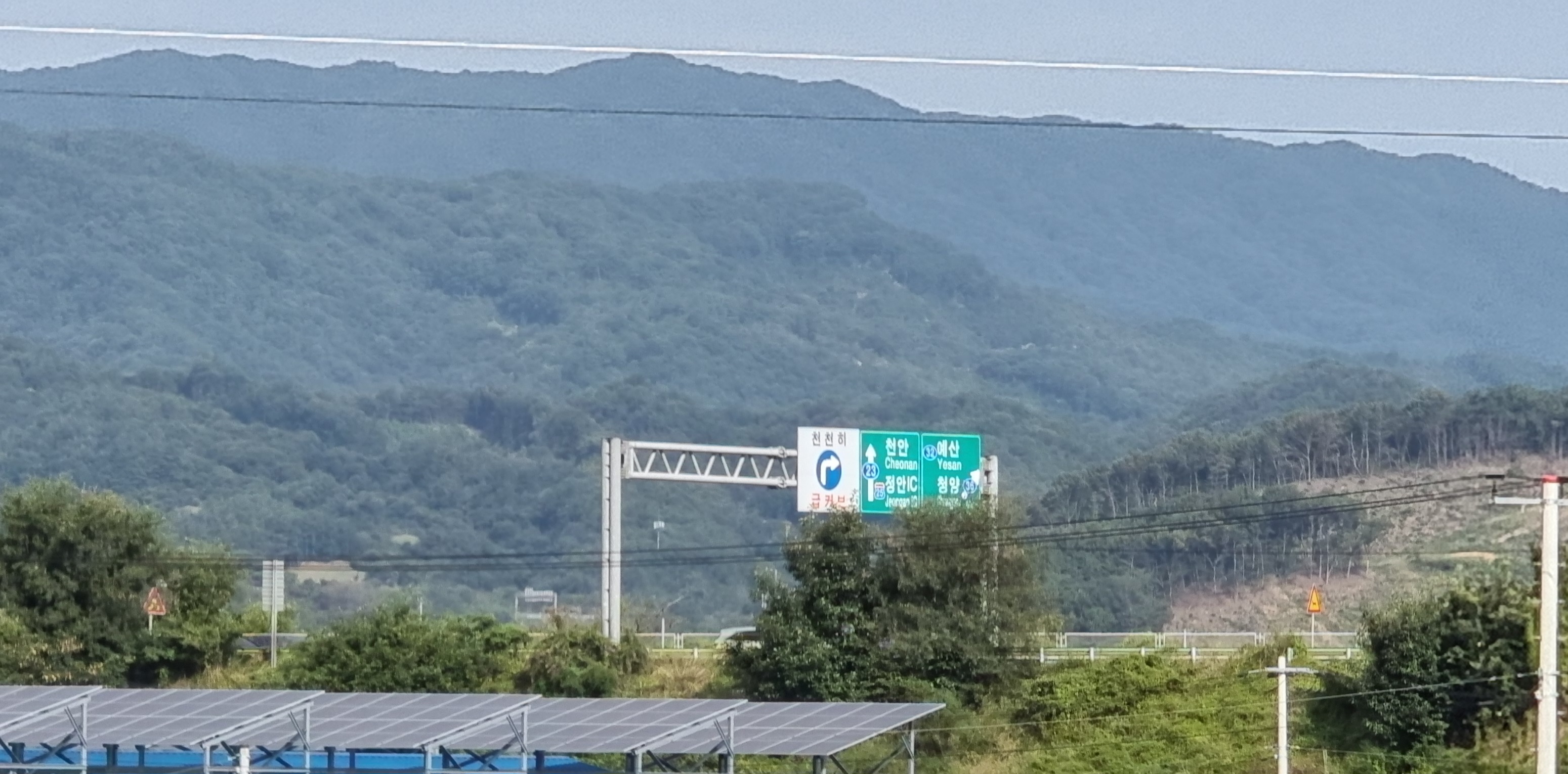둑길 위는 당진 대전 간 고속도로가 지나간다. 언제나 느끼지만, 이 고속도로는 이동 물량이 대단히 많아 보인다. 대형 화물차들의 왕래가 빈번함이 그를 입증한다. 멀리 고속도로 표지판이 보인다. 이 부근이 공주에서 천안 논산 간 고속도로, 공주 서천 간 고속도로, 다진 대전 간 고속도로를 드나드는 복잡한 교통 분기점이기 때문이다.