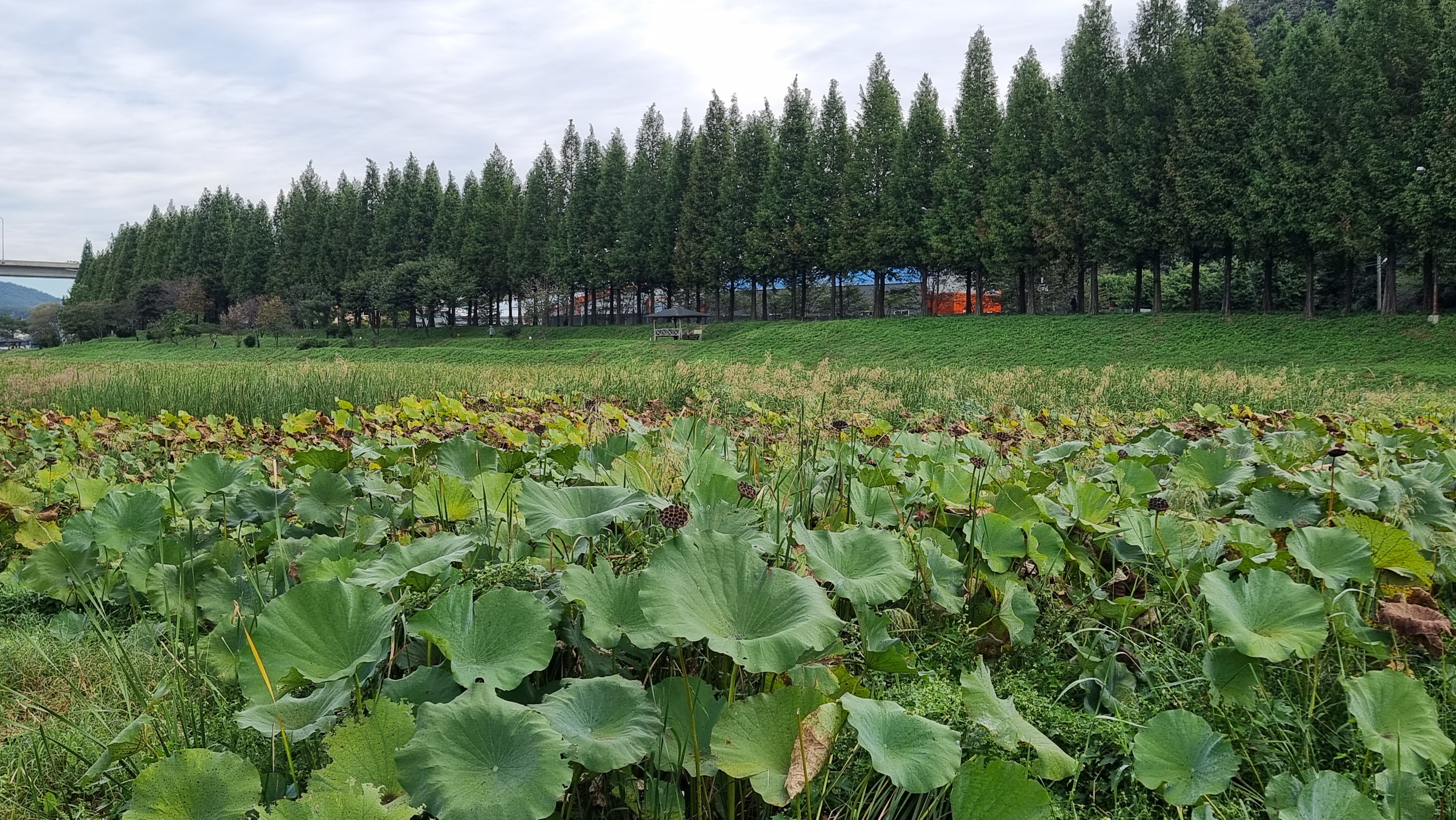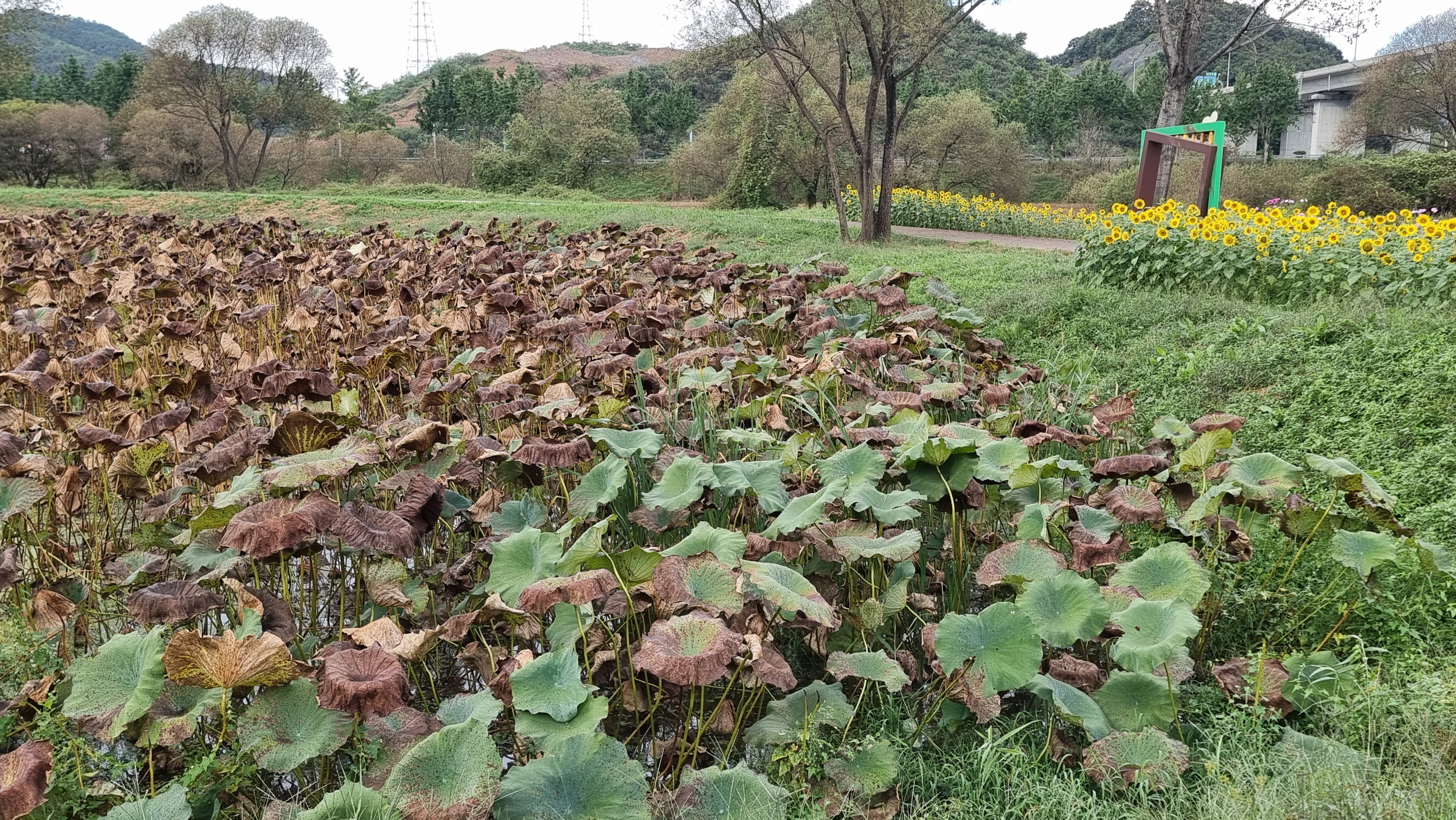 공주 정안천 연못은 갈색 연잎이 퇴색돼 가는 가을 모습이다. 그러나 동혈천 가까운 연못 부근에는 해바라기가 한창이다. 해바라기뿐 아니라 코스모스 그리고 무궁화가 보는 사람의 마음을 환하게 한다.