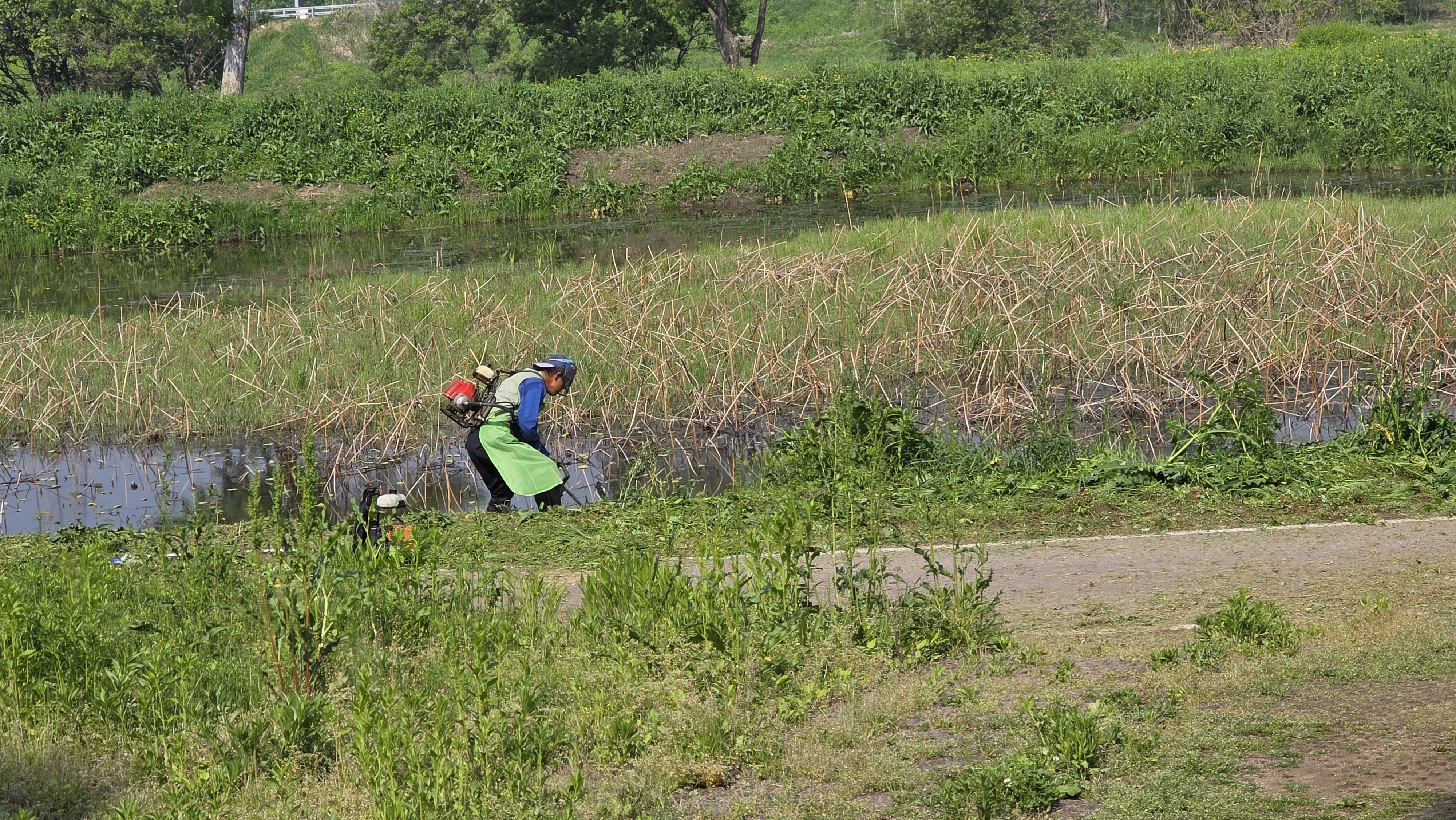 7. 걷기 좋은 길을 위해 연못 주변과 연못가 산책로를 깎는 제초 작업 중이다.