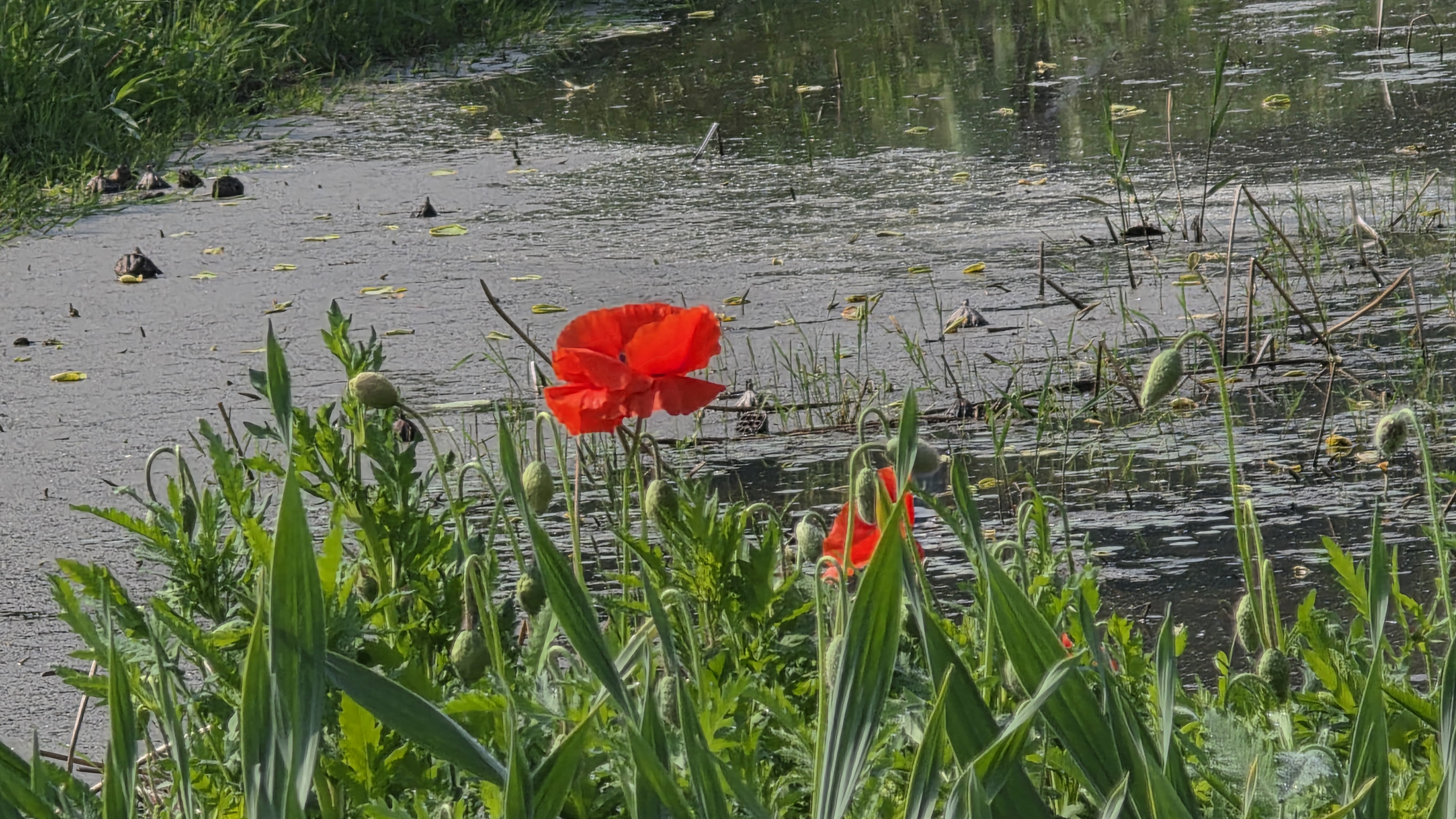 6. 연못에 연잎이 떠 오른 모습이 보인다.