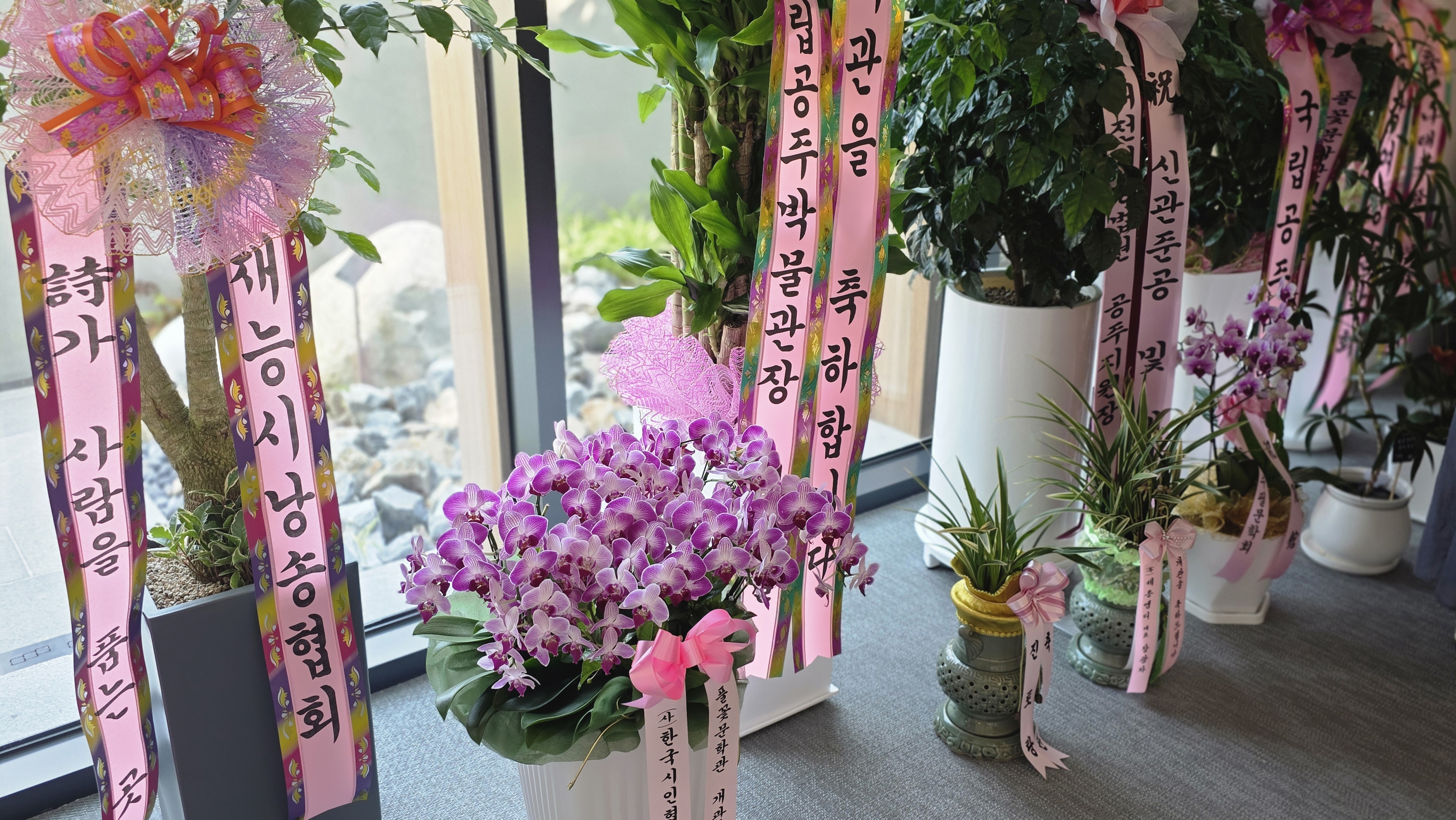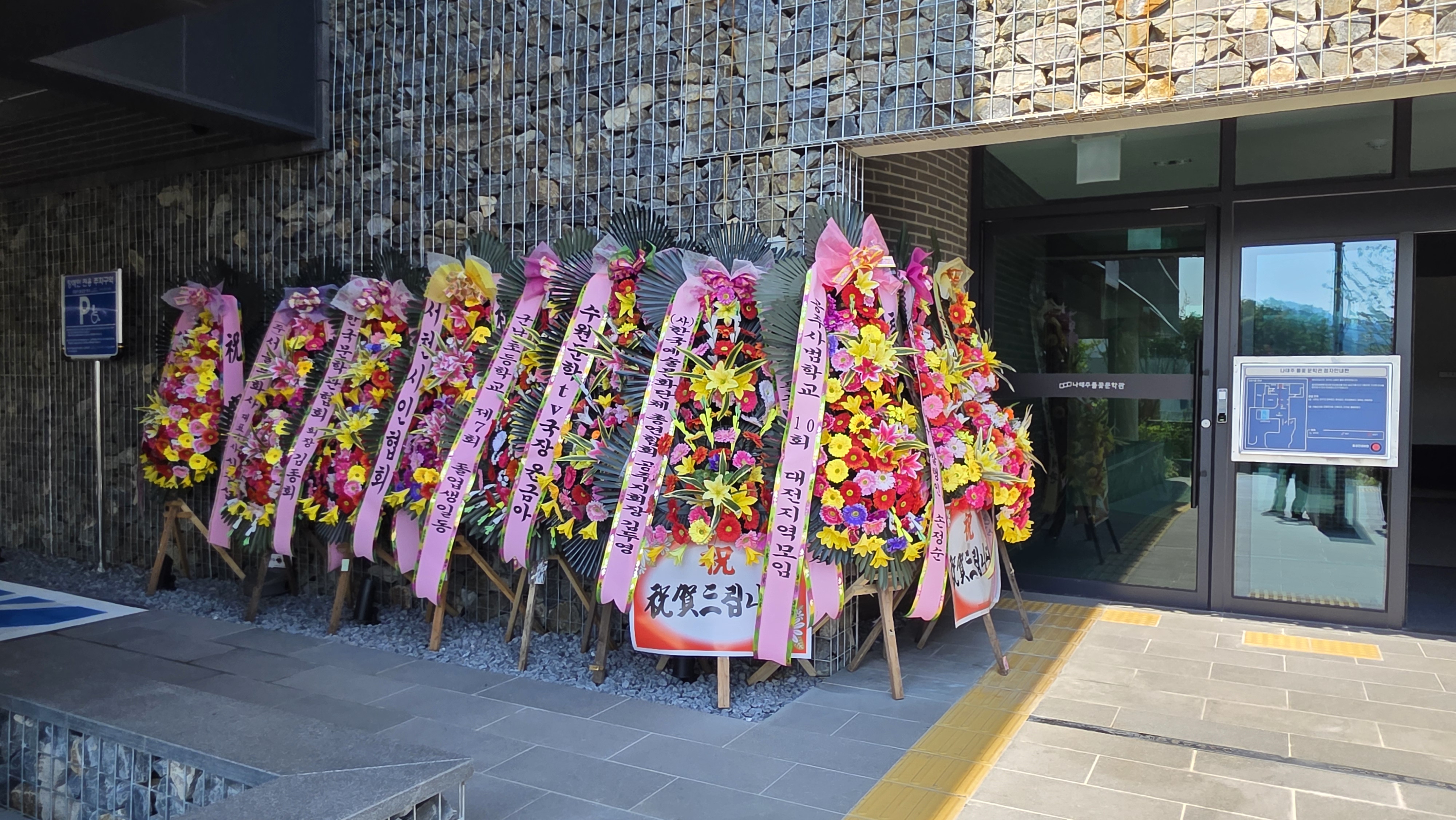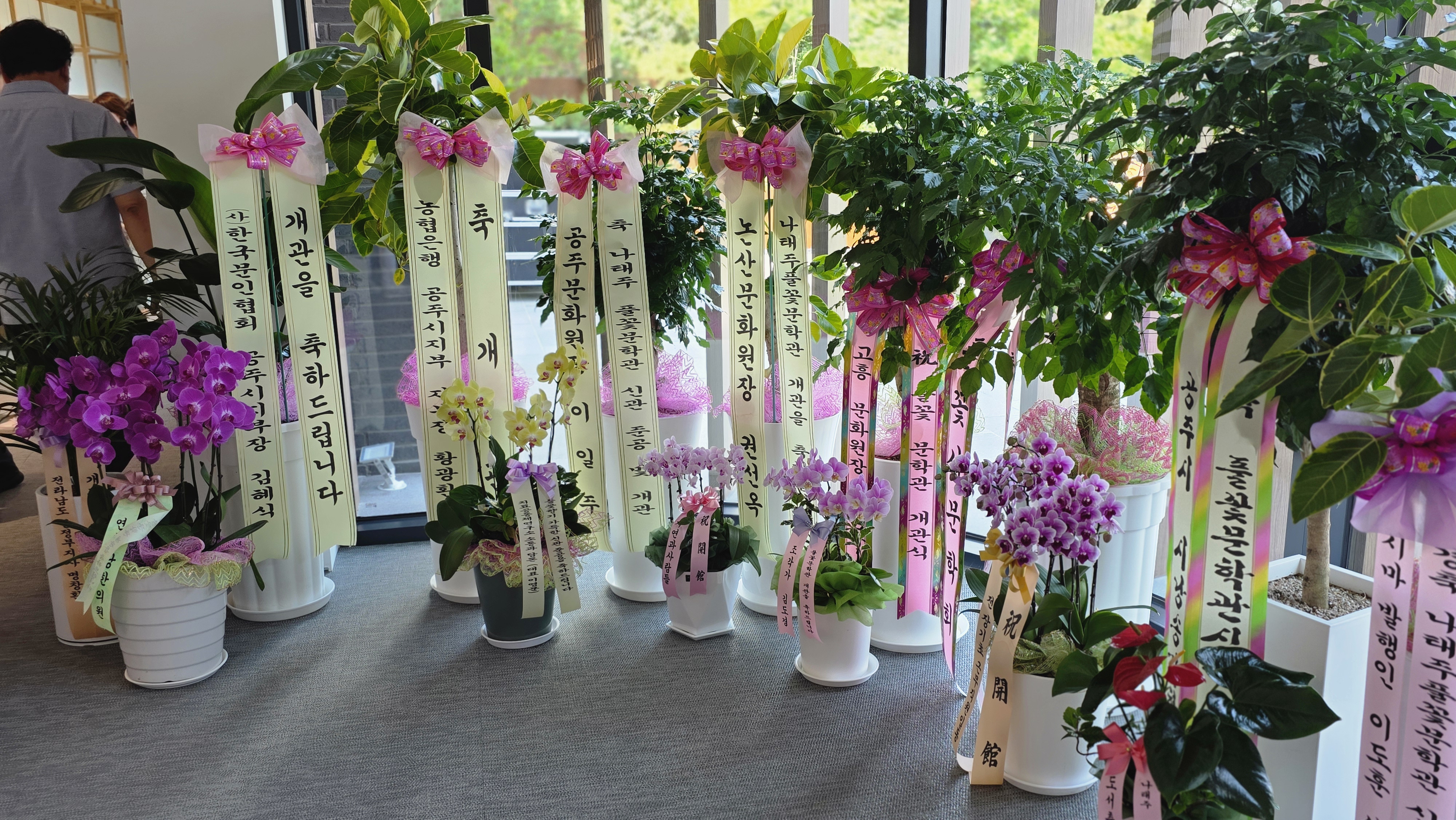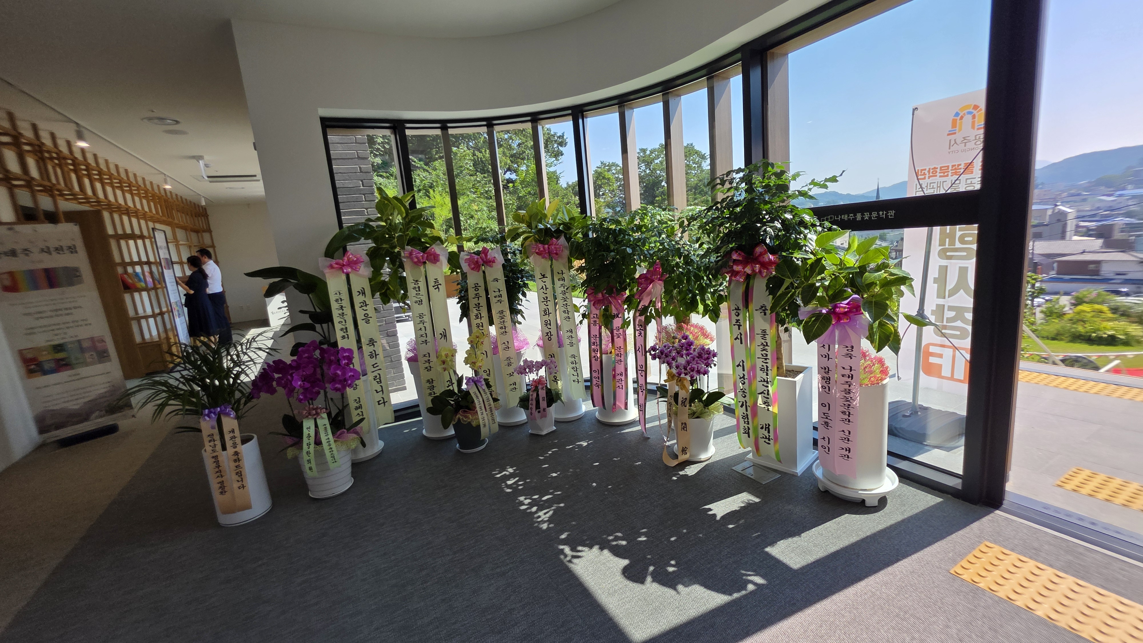 문학관 개관을 축하하는 화환과 화분이다. 문학관 입구에는 대형 화환이 놓였고 2층 행사장 주변에는 작은 화환이나 화분을 배치했다. 여러 단체나 개인이 축하하는 마음이 담긴 것들이다. 다양한 기관이나 단체의 이름이 보였다.