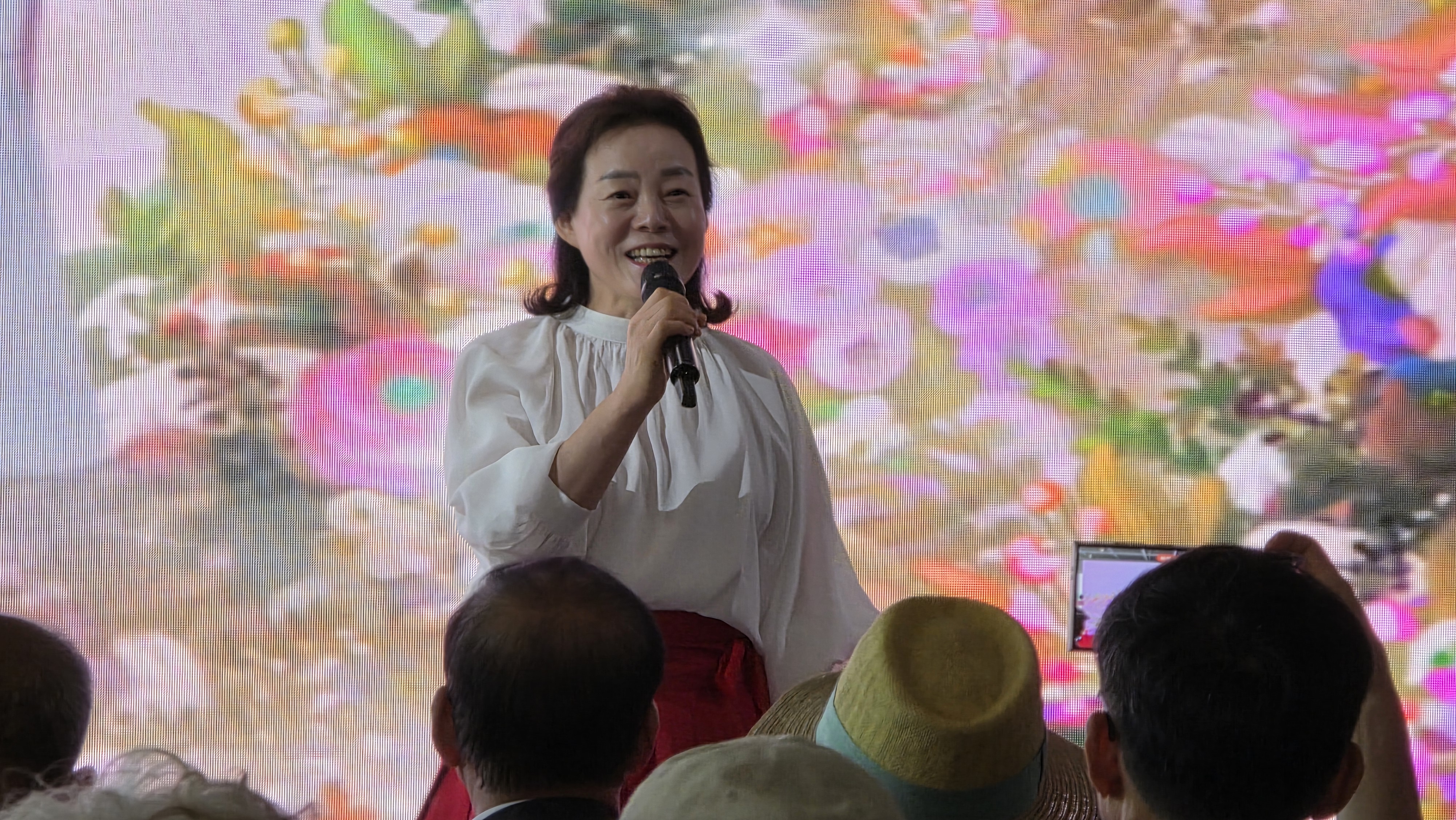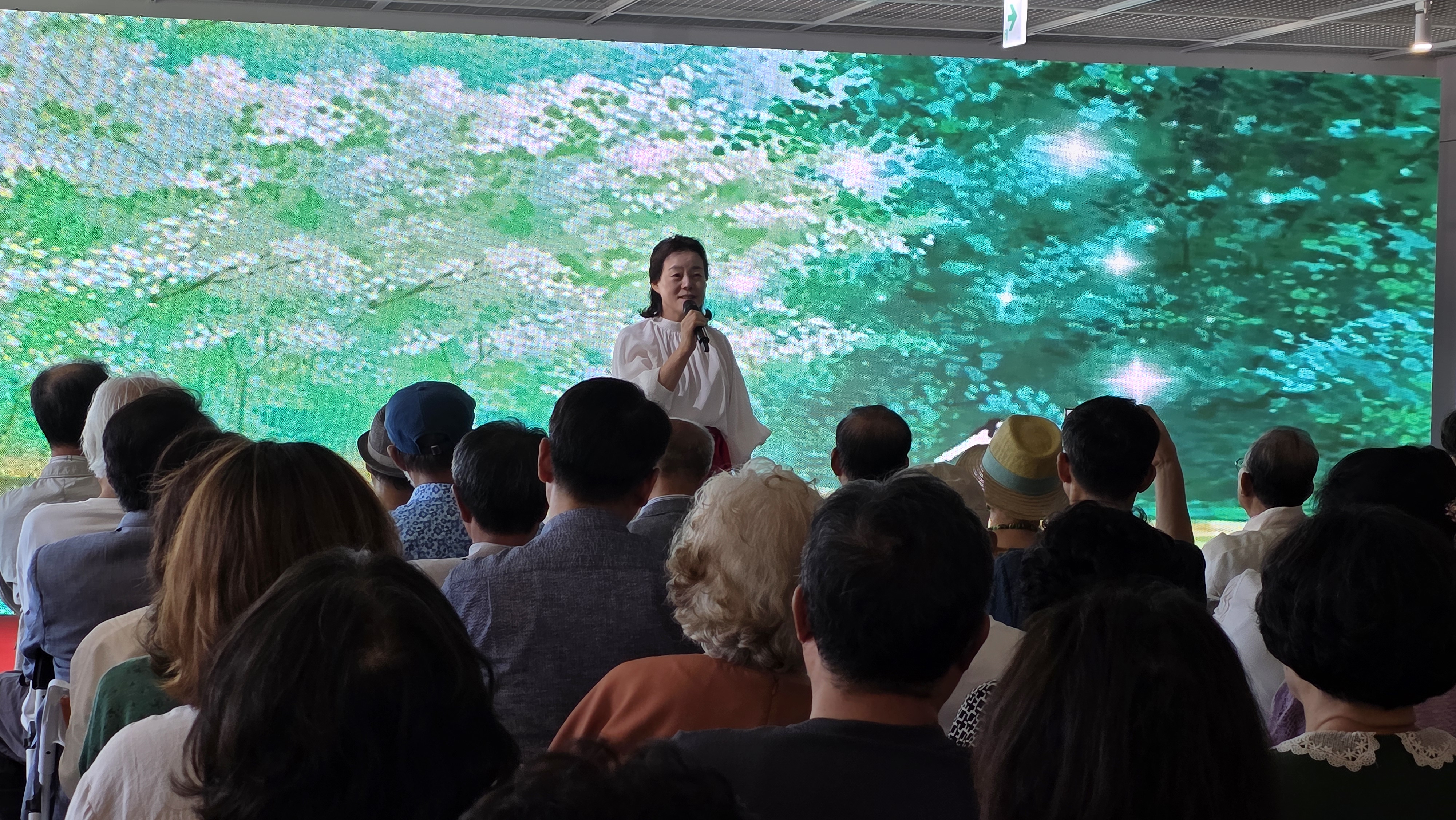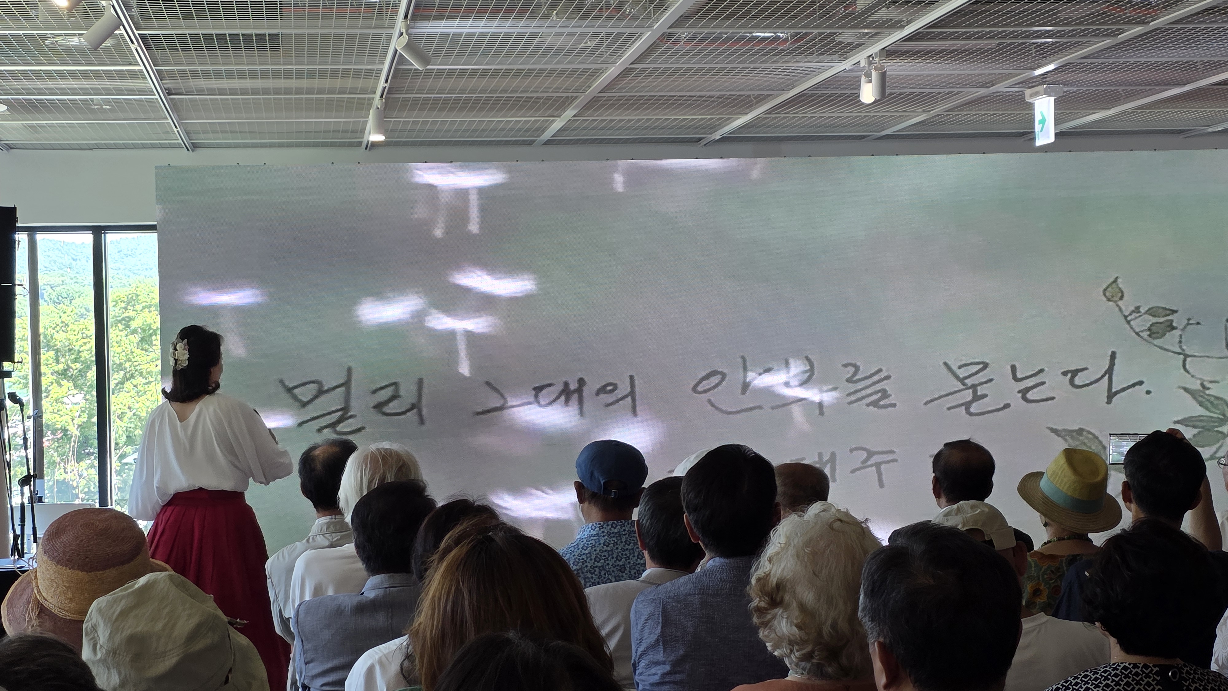 오후는 시낭송으로 나태주 시인의 '멀리서 그대의 안부를 묻는다'였는데 처음부터 무대에 선 게 아니고 낭송가가 통로에 섰다가 잔잔한 바탕 음악이 깔리면서 서서히 무대로 오르는 자연스러운 낭송이었다.