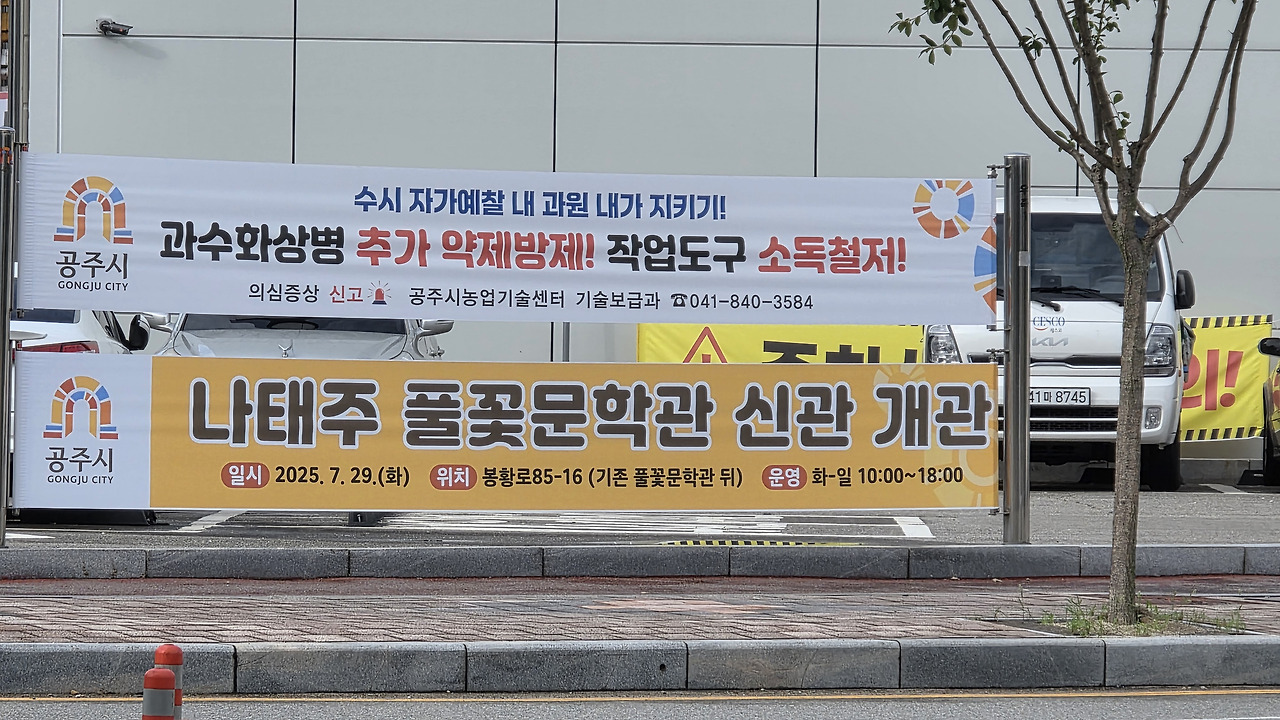 여러 날 전부터 공주 시내 곳곳에 행사 알림 막이 붙었는데 '나태주풀꽃문학관 신관 개관'이라는 내용이다. 여기 적힌 신관은 新館으로 새로 지은 건물을 말한 것이지 신관동이 아니다. 신관동에 이 플래카드가 붙은 걸 봤는지 신관만 보고 공주시 신관동에 새 문학관을 지은 줄 아는 사람이 있다. 분명히 나태주풀꽃문학관은 공주시 봉황산 밑 공주사대부중고 옆에 새로 지어졌다.