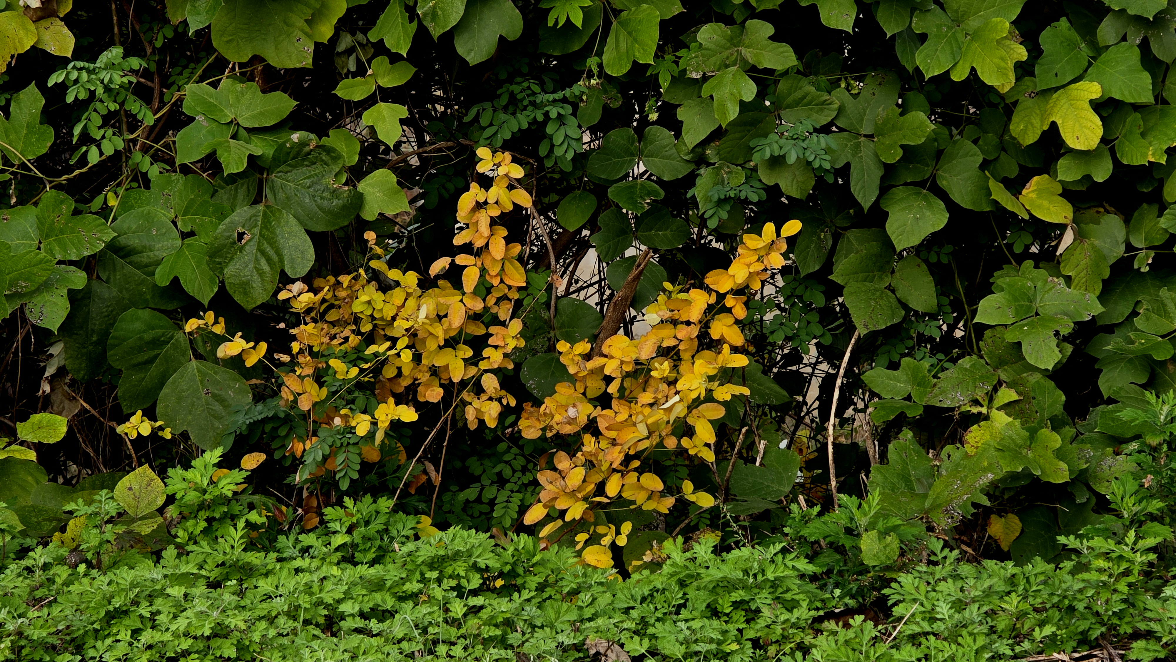 파란 나무 앞의 노란 잎, 이름은 모르지만, 가을을 알린다.