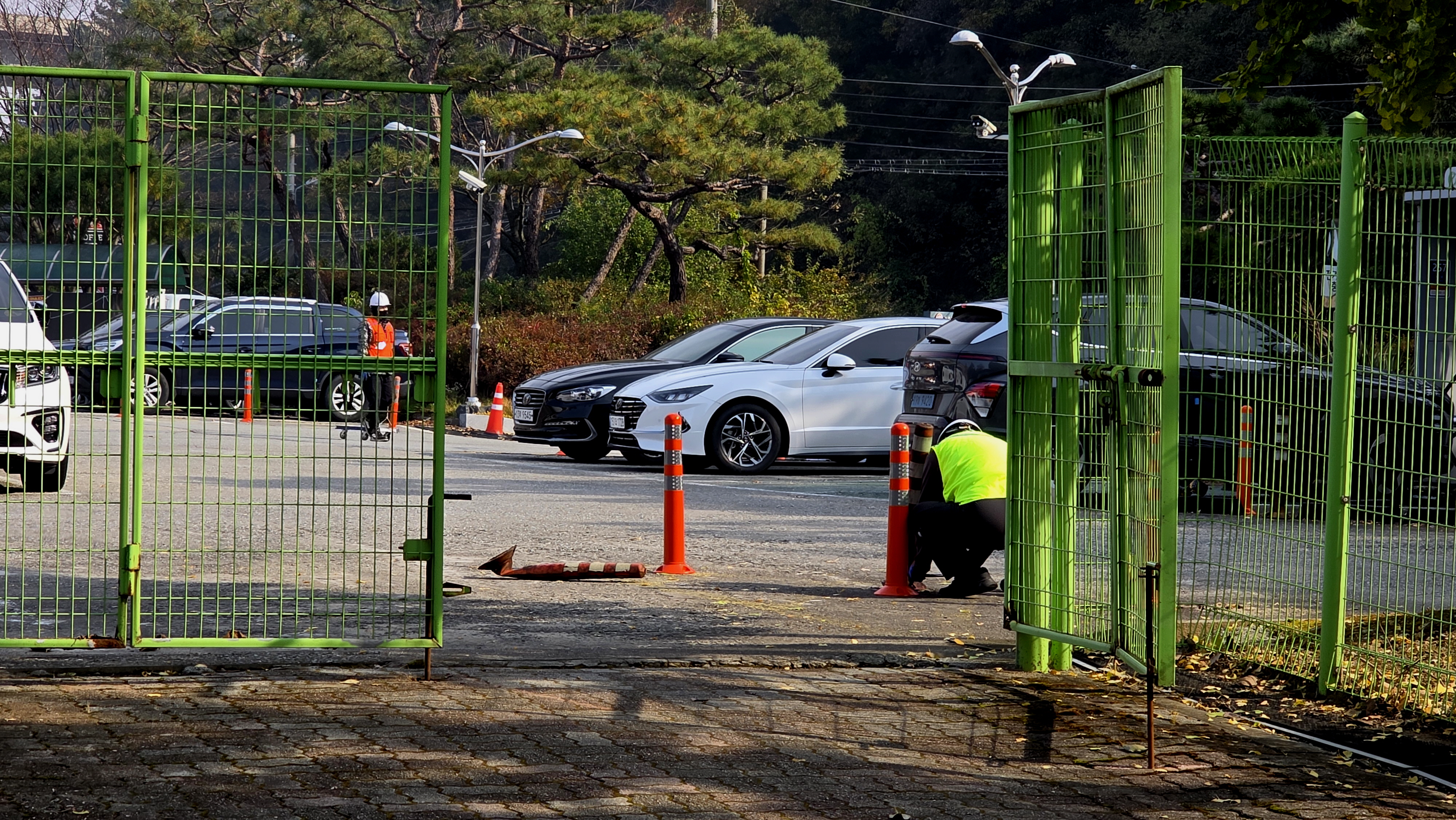 론볼장 입구 공사 현장, 가이드 포스트를 교체하는 작업이 진행 중이다.