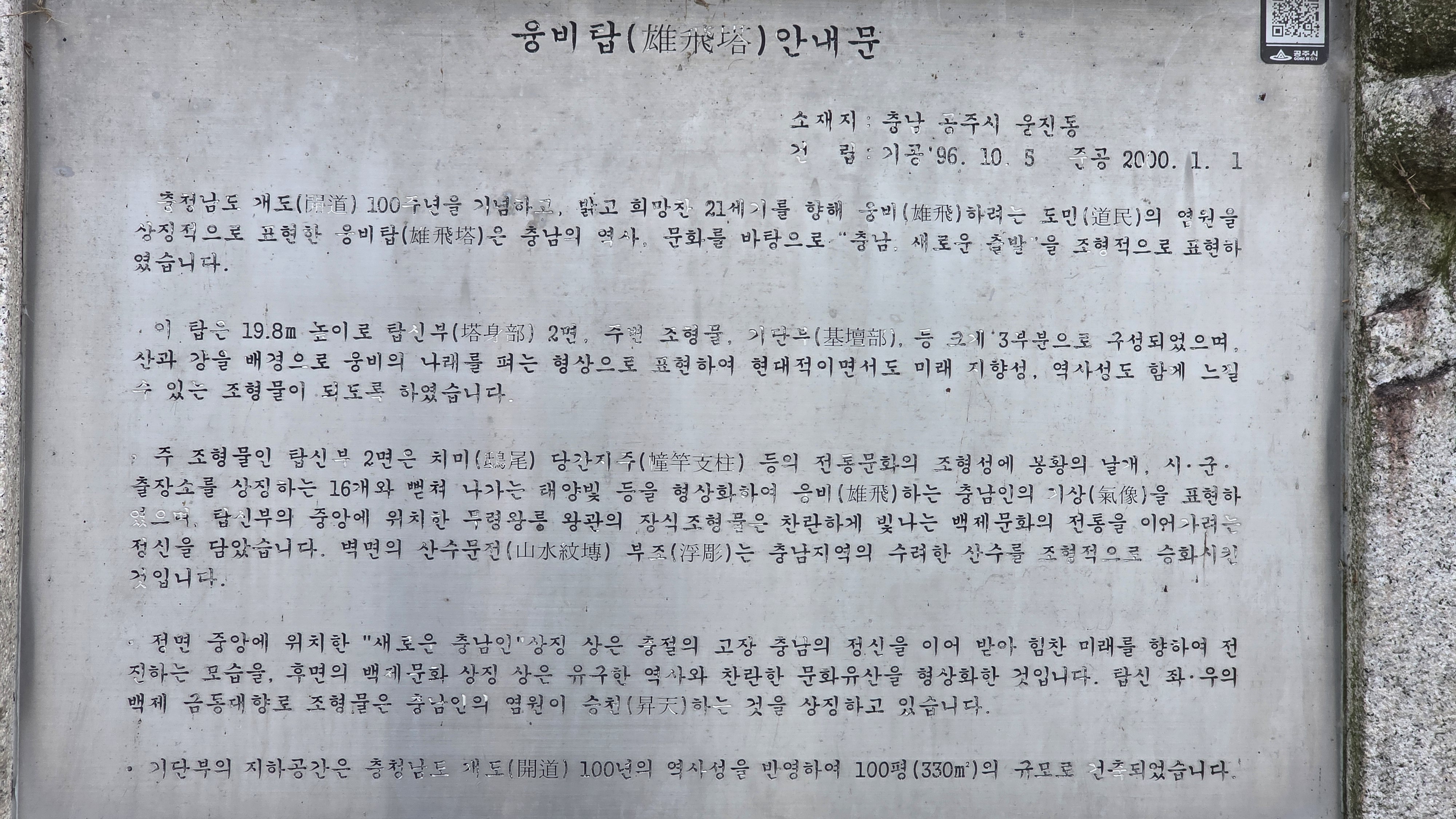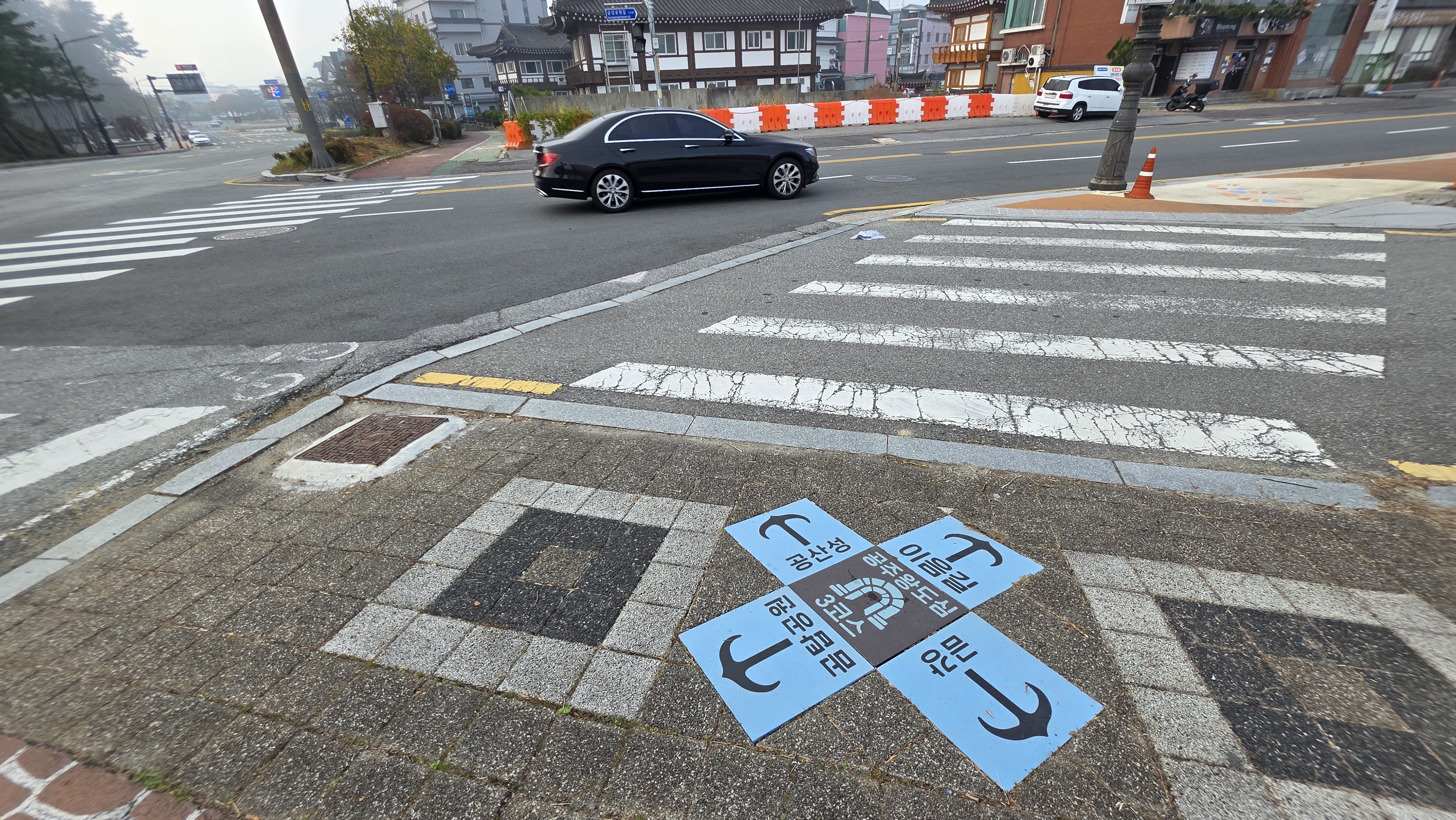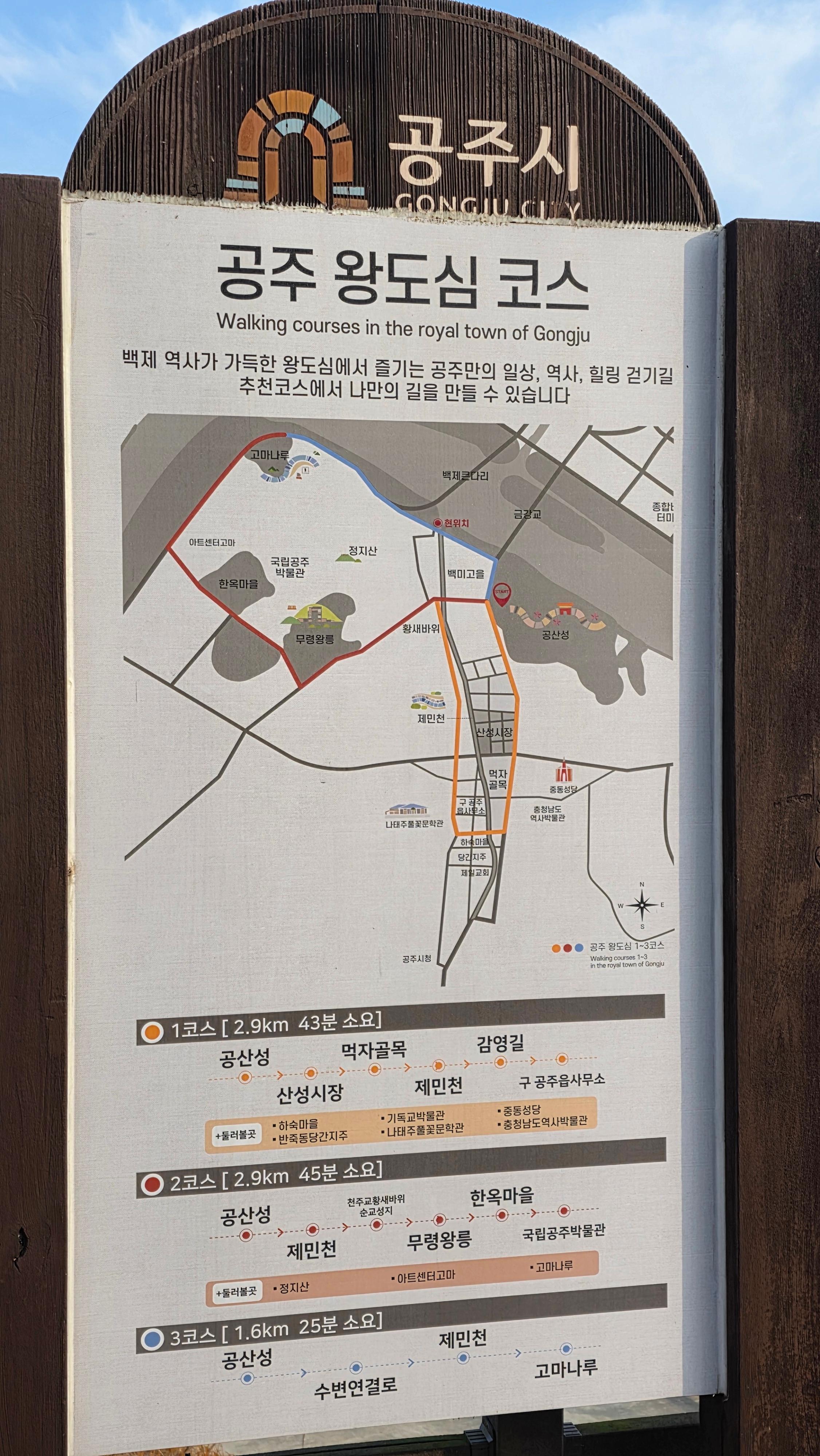 데크길 광장(09:50)에서 웅비탑(10:01), 거쳐서 한옥마을 건너 금강온천에 도착하기(10:45))까지 55분