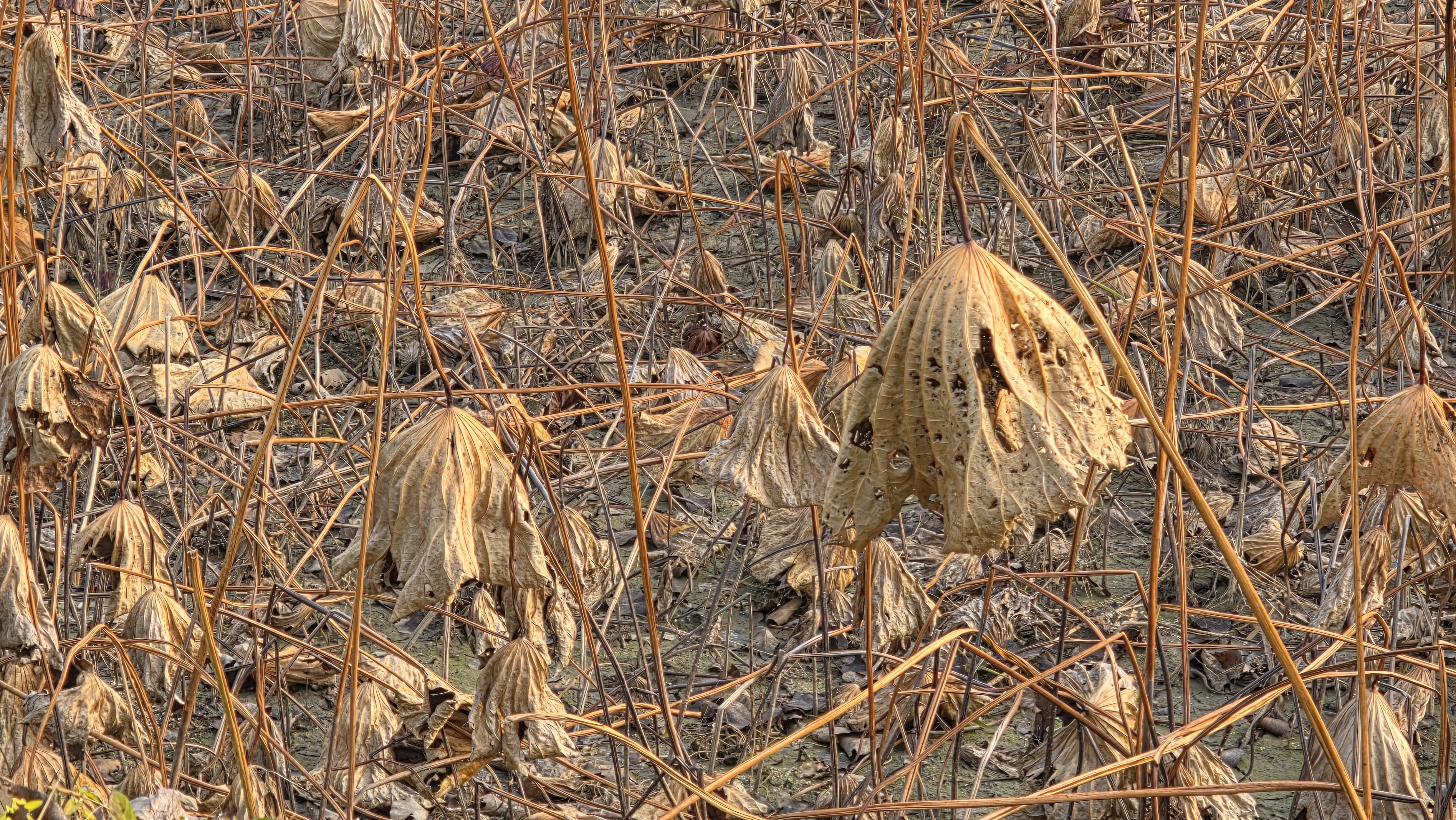 정안천 연못의 연꽃 피었던 연잎과 연대공이 추레하다.