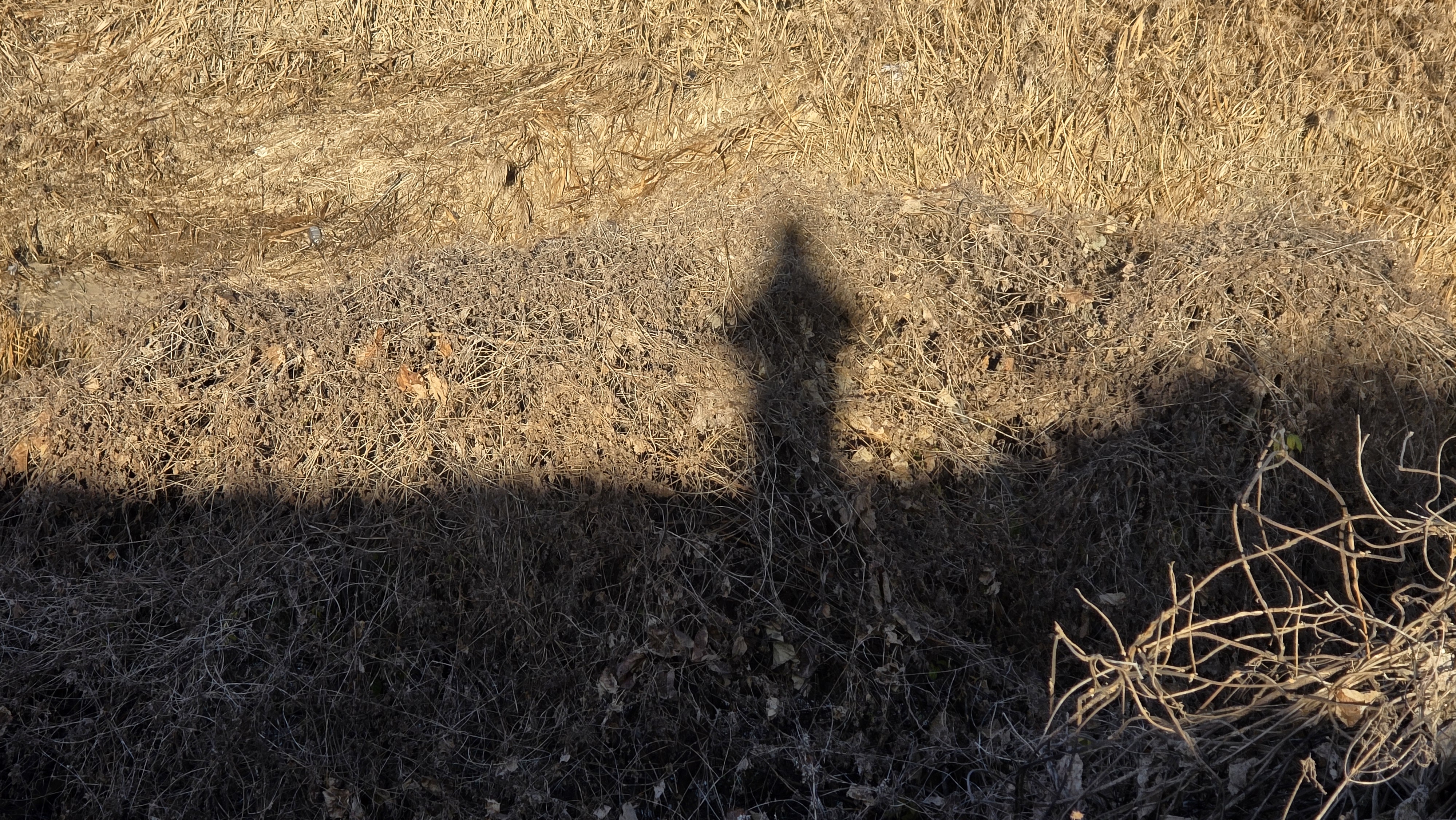 둑 길에서 아래로 길게 보이는 그림자, 바로 내 것이다.