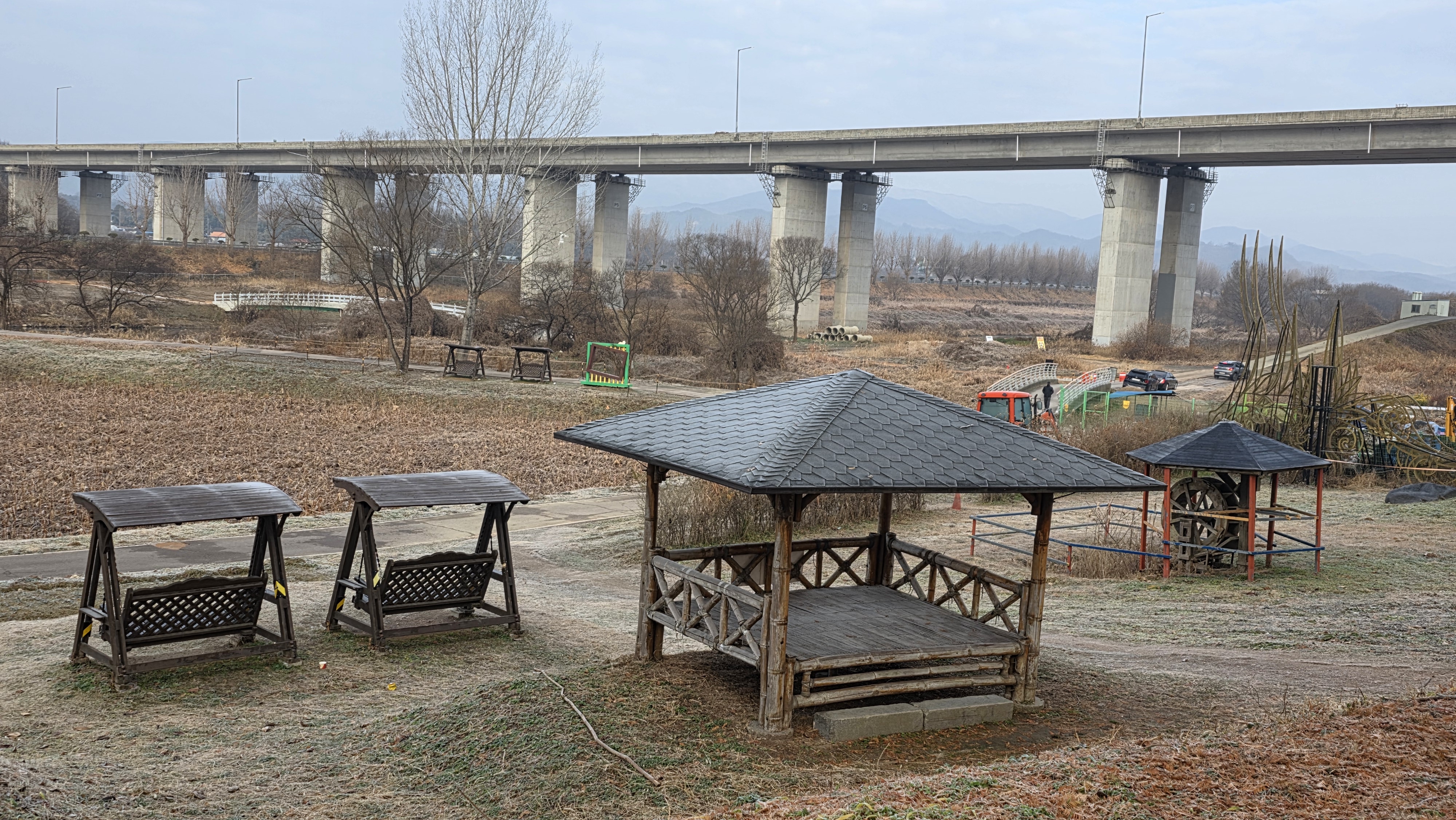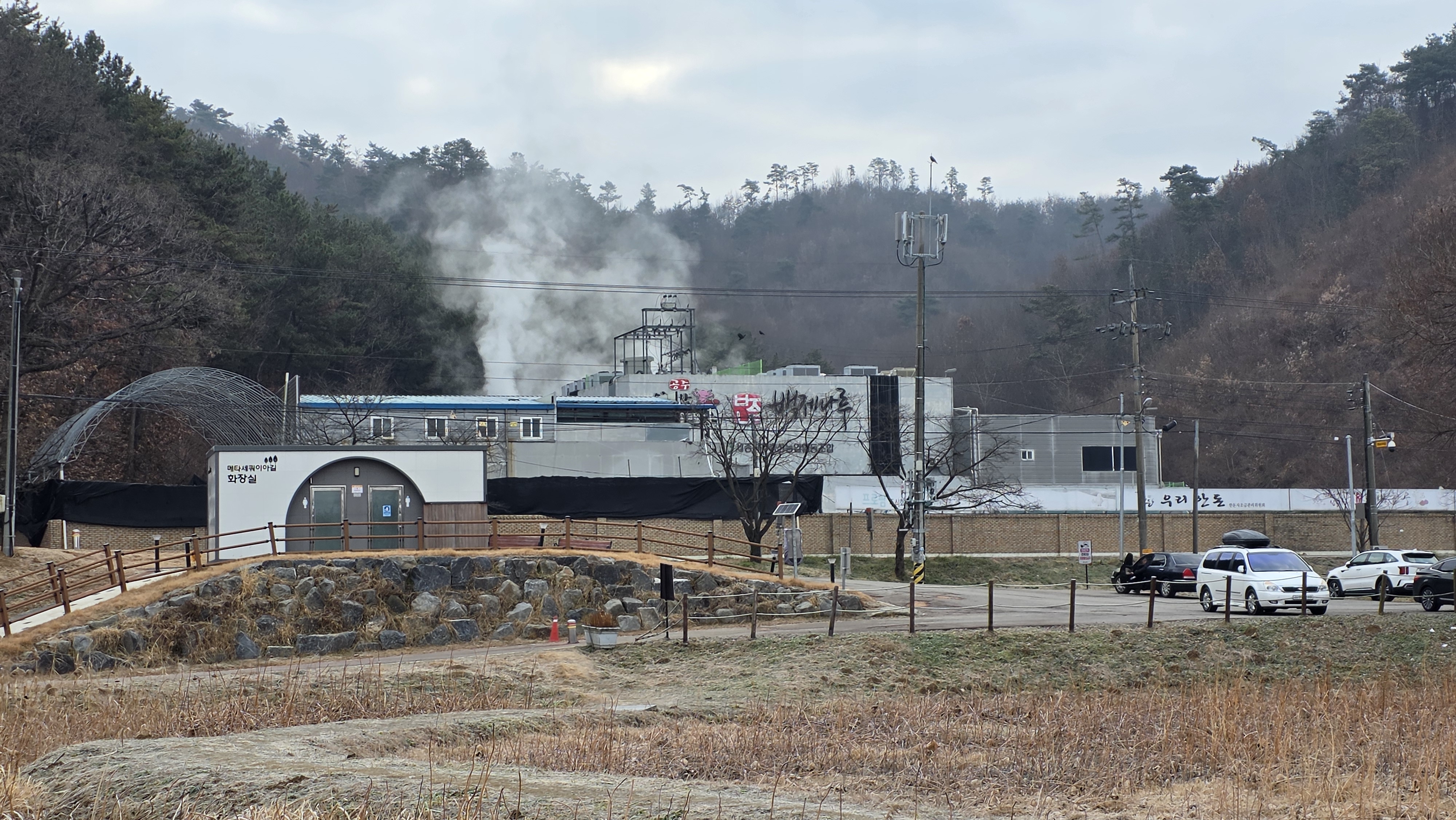 주차장과 화장실 그리고 백제나루가 보이는 풍경