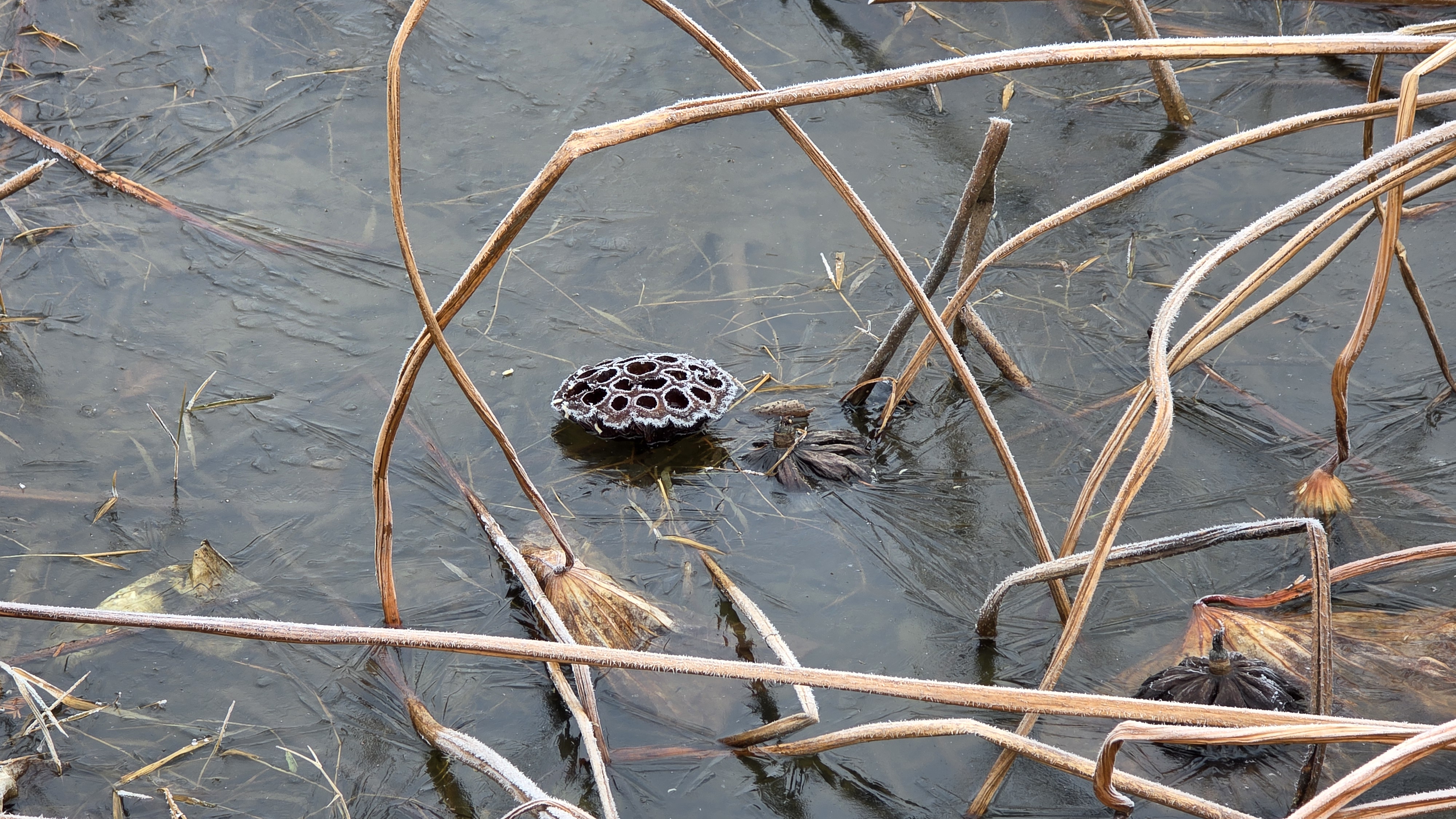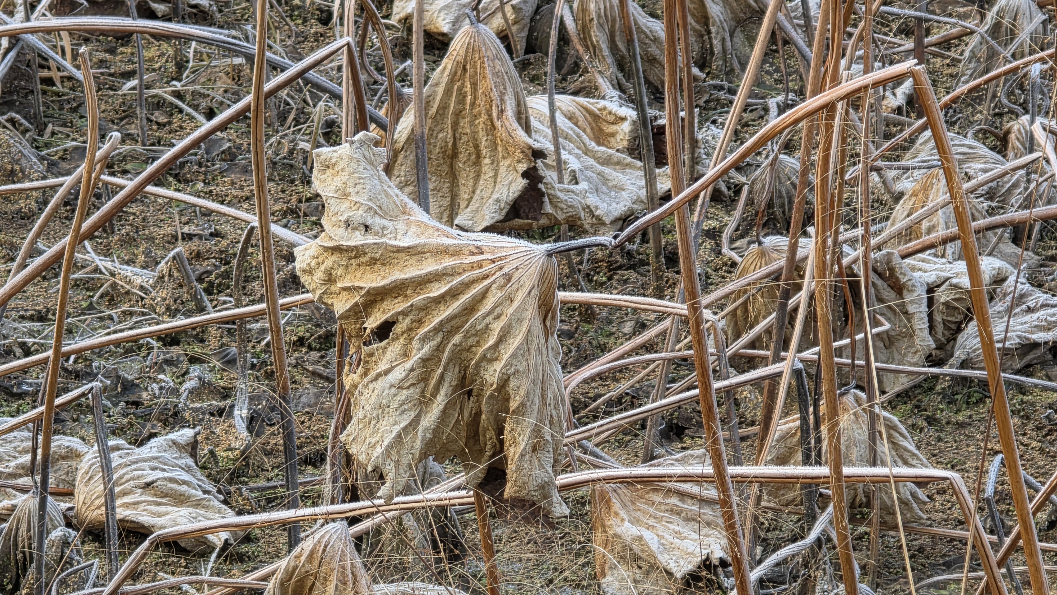 겨울에 웅크린 연잎이다. 겨울잠을 자는 듯 숨죽이고 있다.