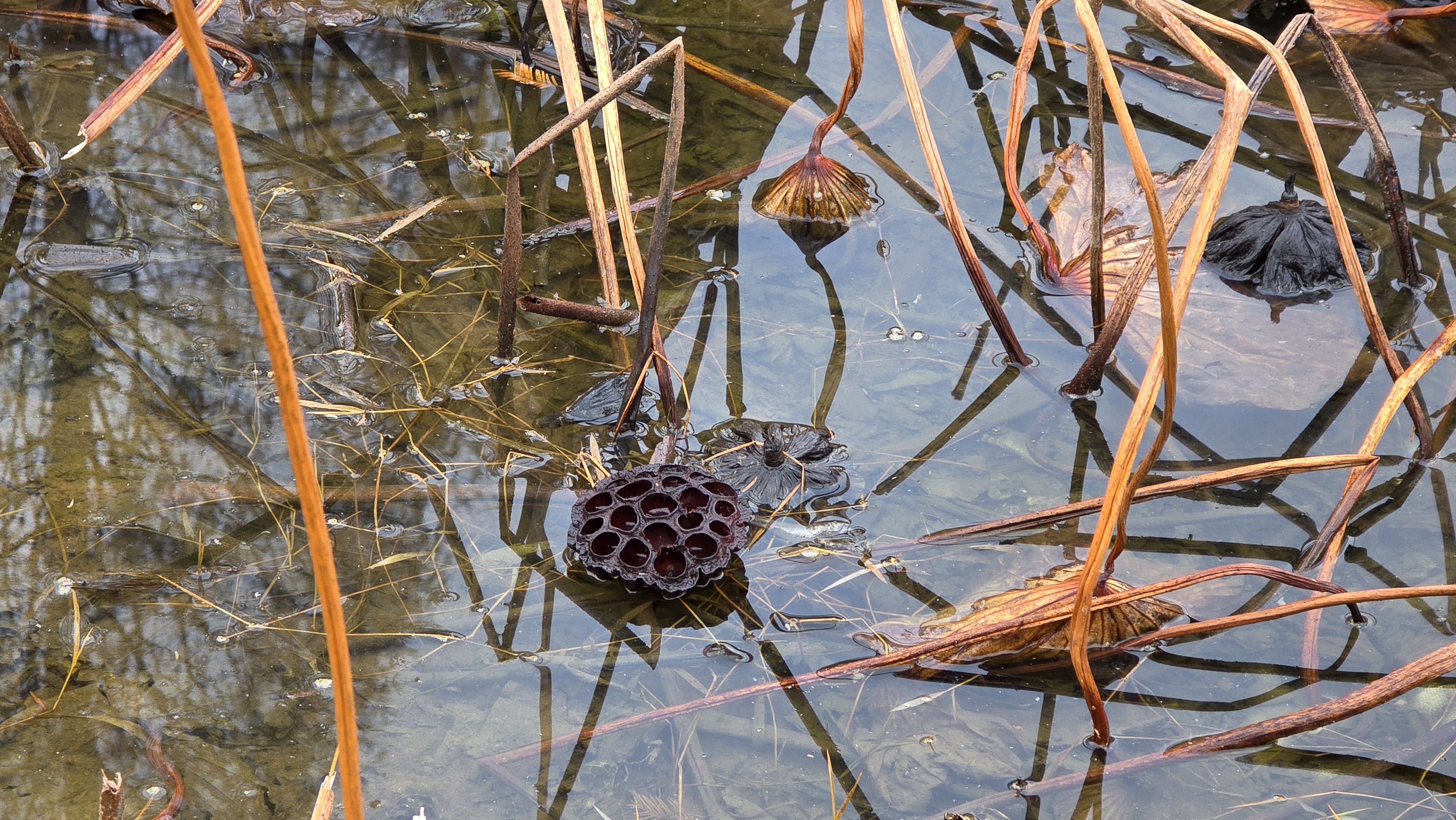 연못에 ㅅ기들어버린 연잎과 연대공이 처량하게 서 있다.