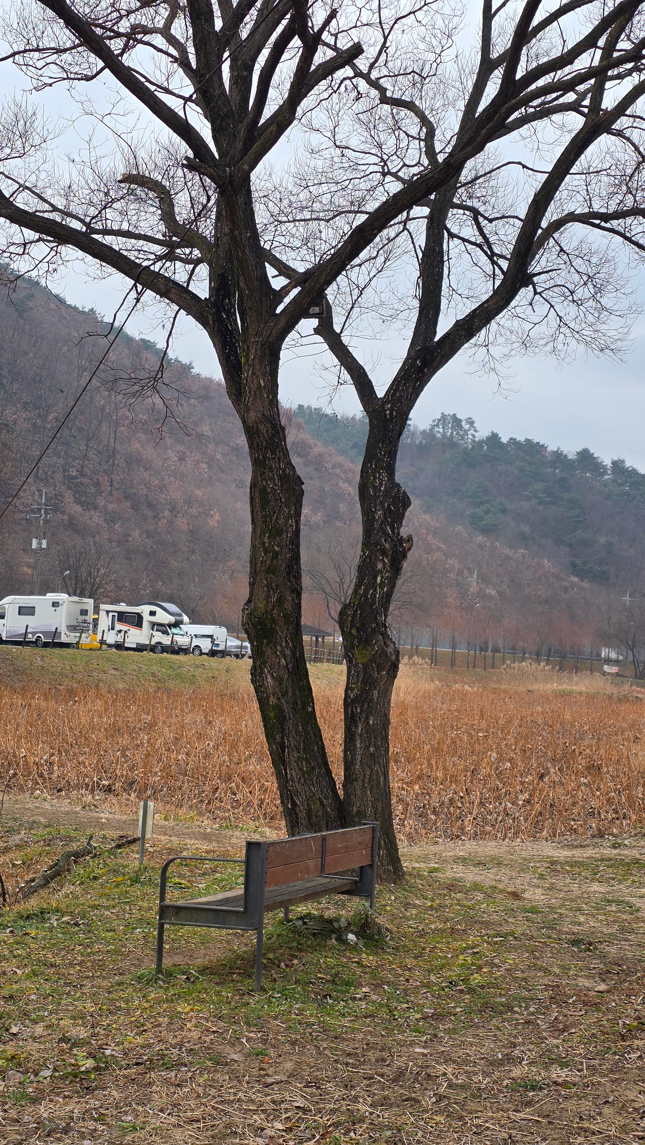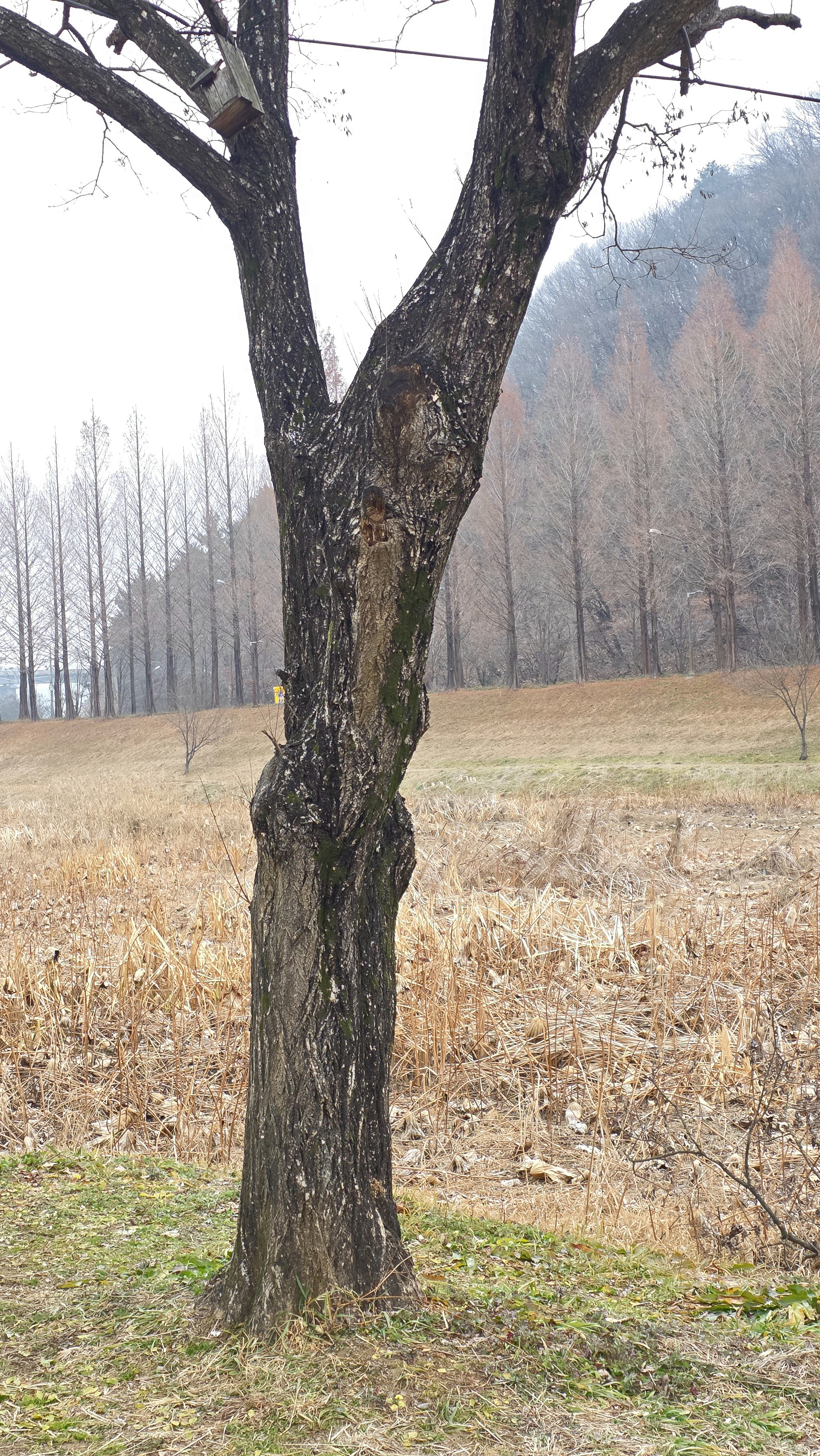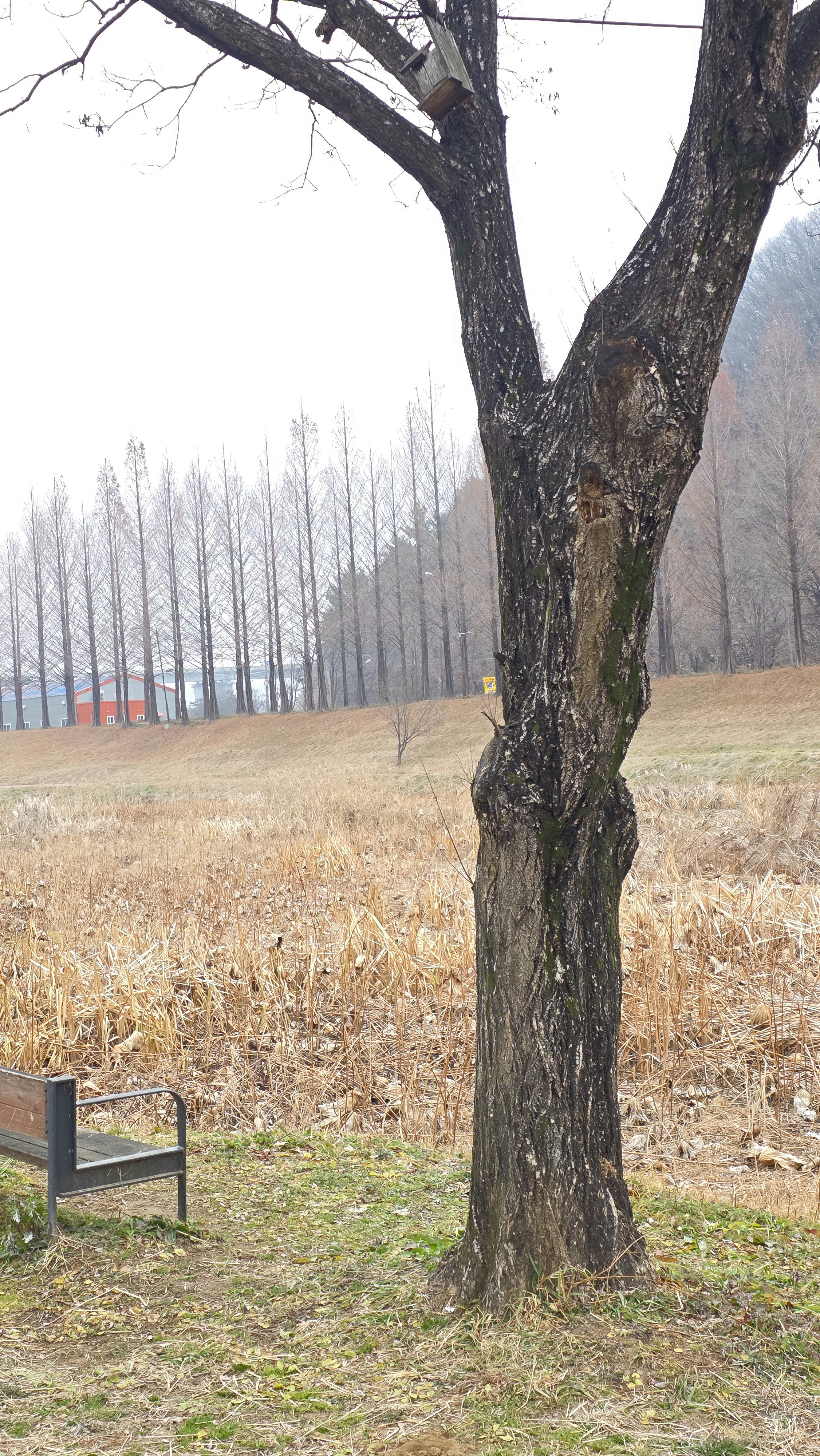 산책길에서 특이하게 보이는 나무 한 그루, 오늘도 그 나무를 봅니다. 주변에 벤치 하나 놓였고 나무 밑에는 겨울이지만, 쑥도 자라고 풀도 퍼렇게 보입니다. 군데군데 두더지가 내뱉은 흙더미가 작은 봉우리를 만든 것도 있습니다.