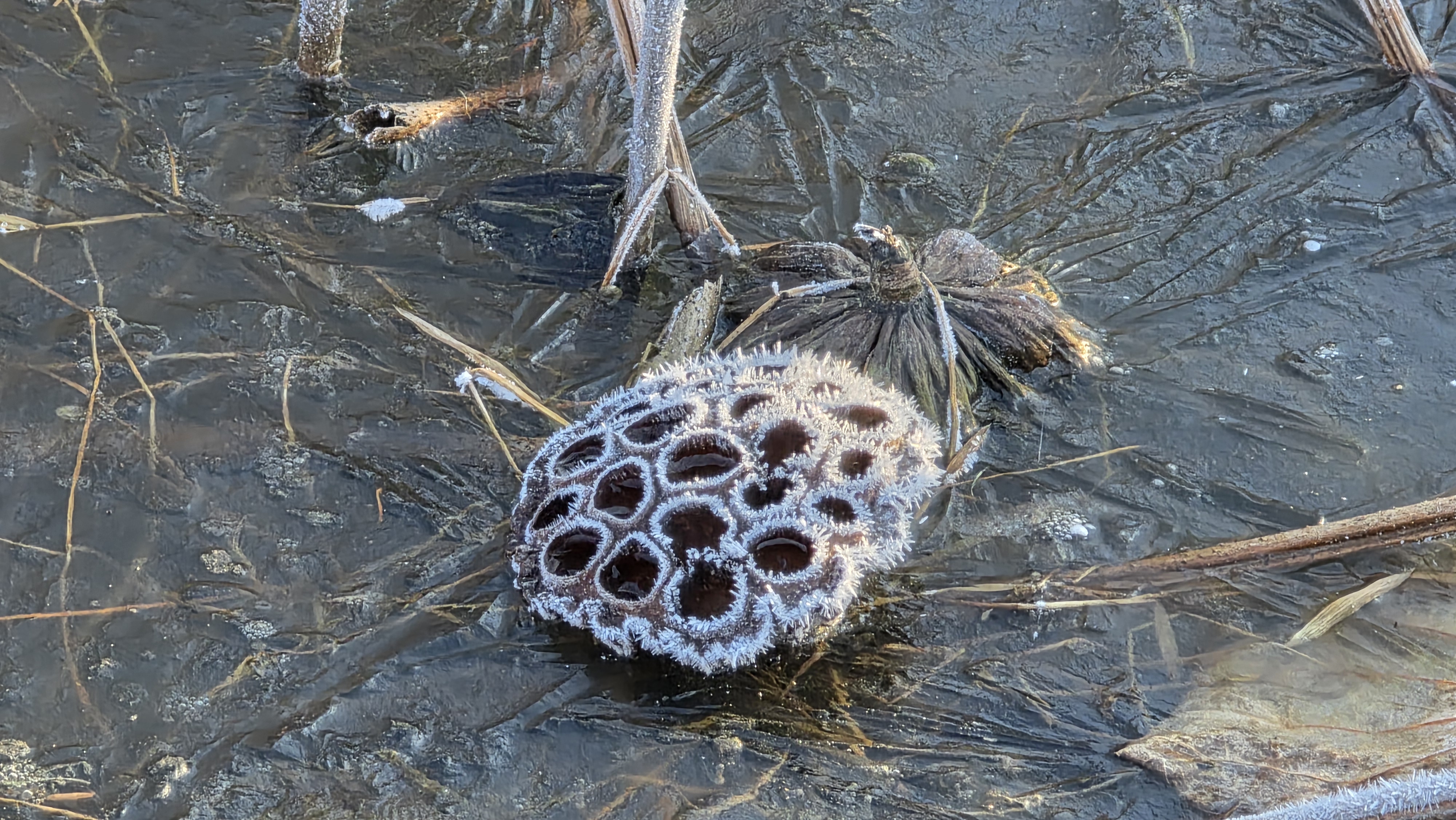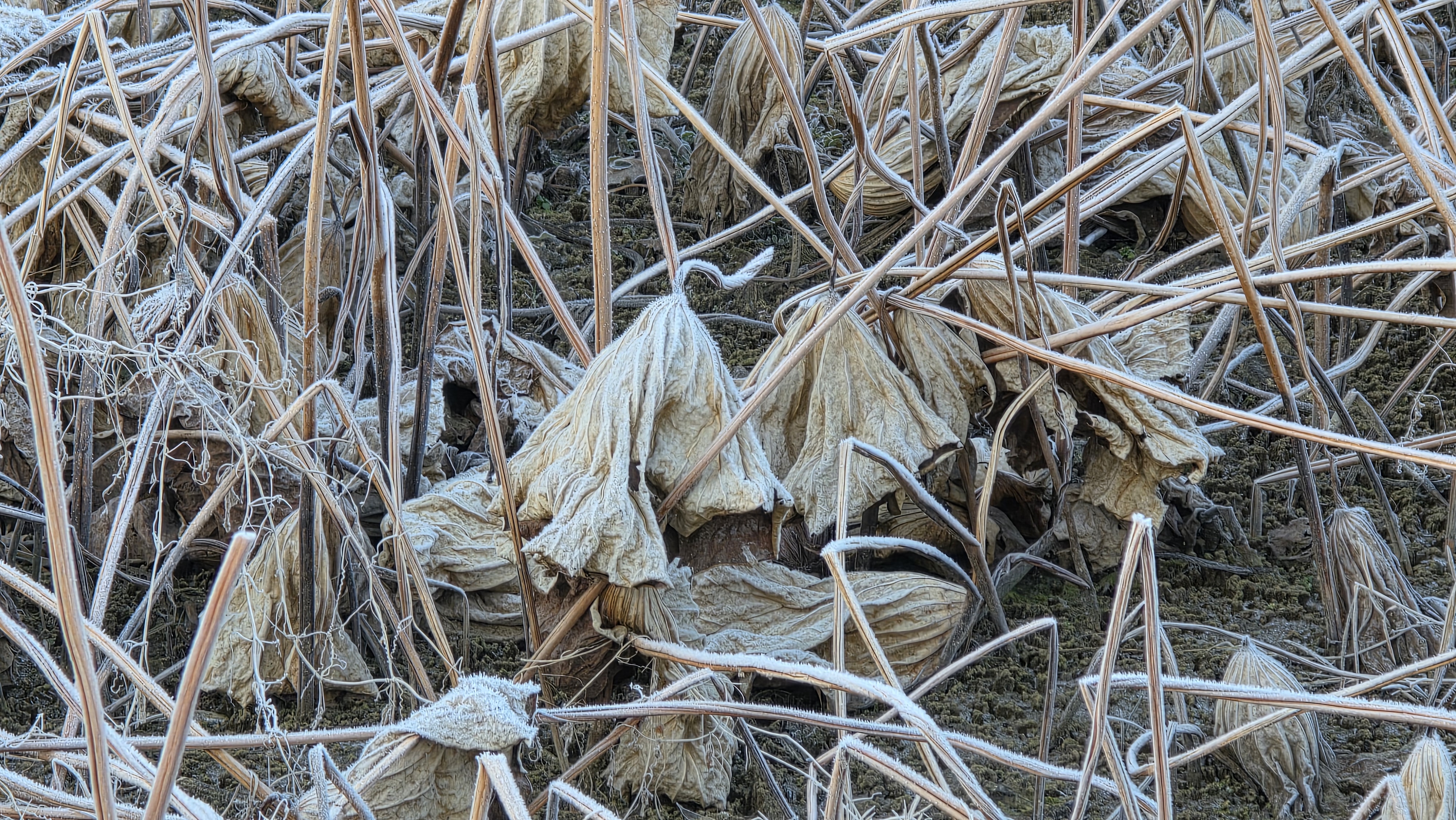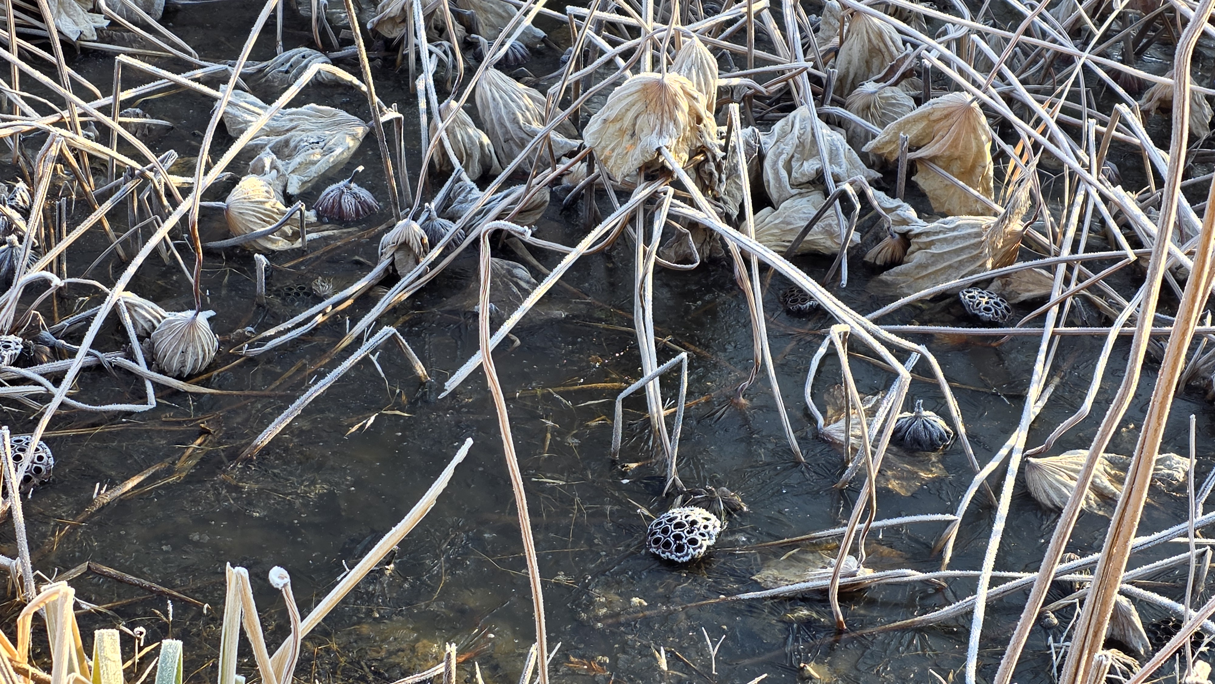 눈이 올 듯 말 듯 하지만, 눈이 내리지는 않는다. 오늘도 천천히 정안천 연못가를 걸었다. 연못 바닥에 갈색 잔해가 진한 서리를 맞은 모습이다. 갑옷이나 투구 같은 형상으로 보이기도 하는 겨울 연못 바닥이다.