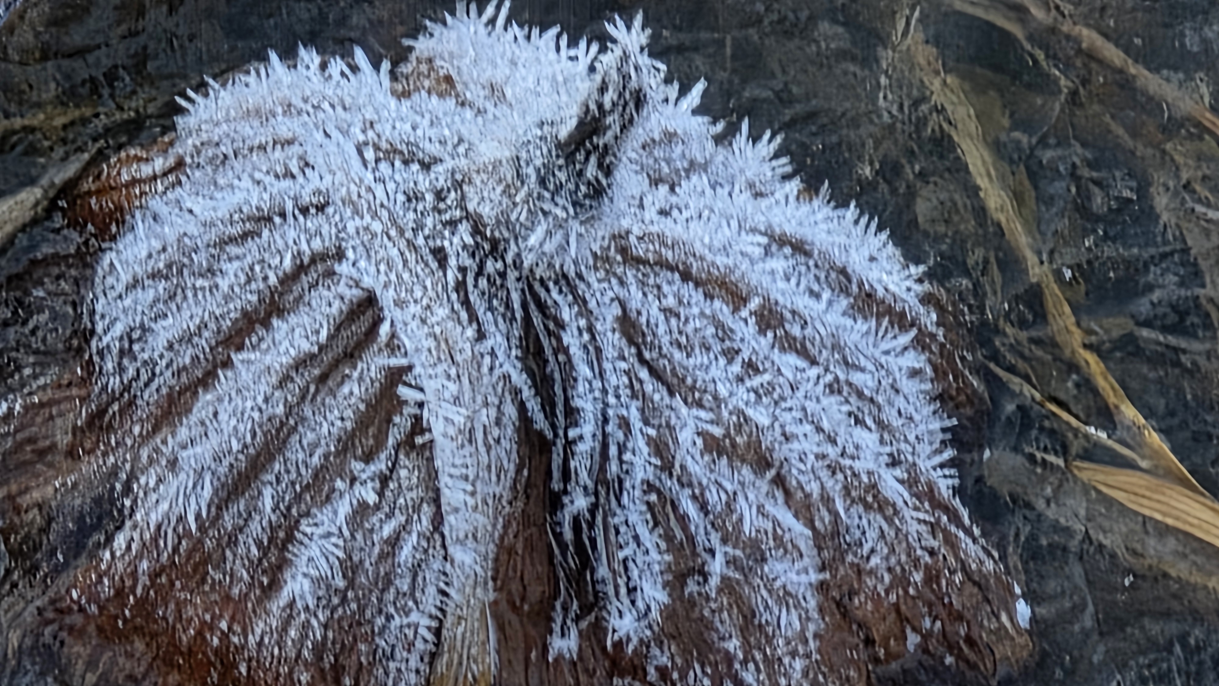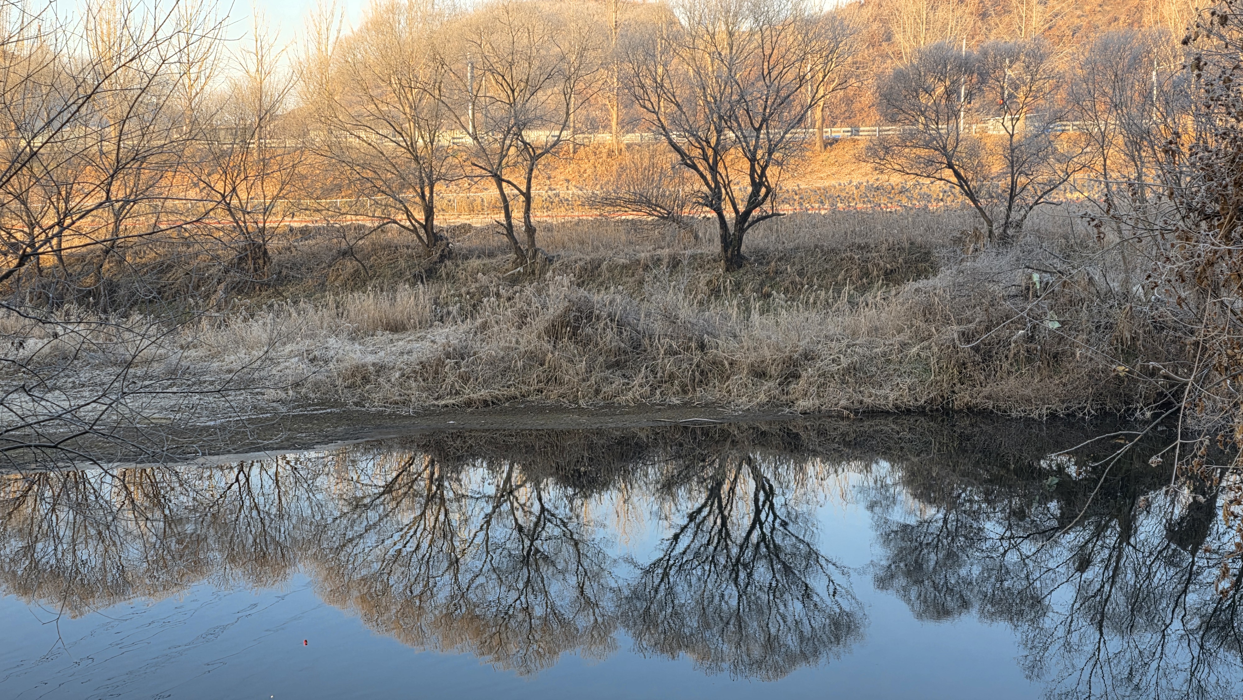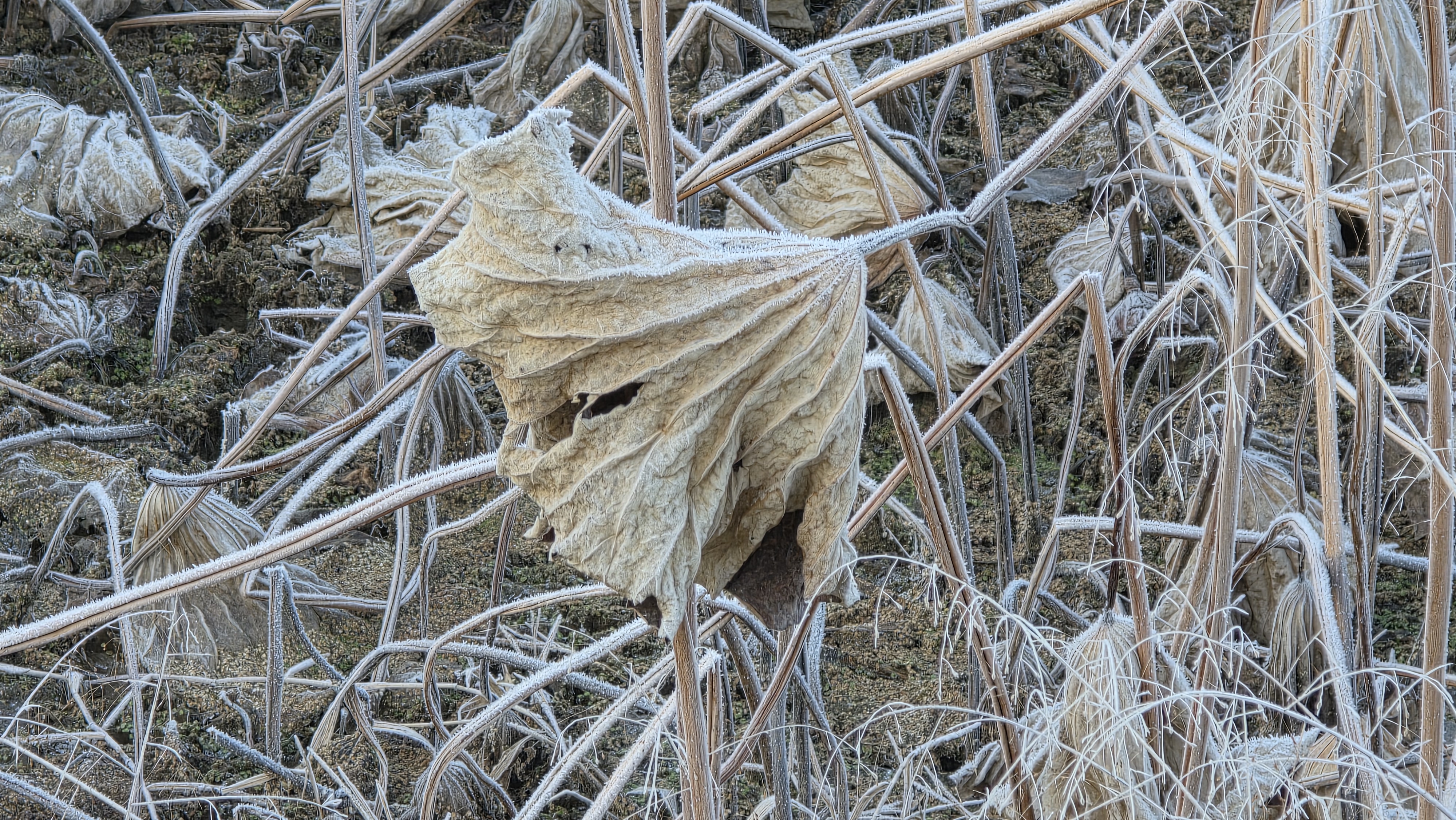 눈이 올 듯 말 듯 하지만, 눈이 내리지는 않는다. 오늘도 천천히 정안천 연못가를 걸었다. 연못 바닥에 갈색 잔해가 진한 서리를 맞은 모습이다. 갑옷이나 투구 같은 형상으로 보이기도 하는 겨울 연못 바닥이다.