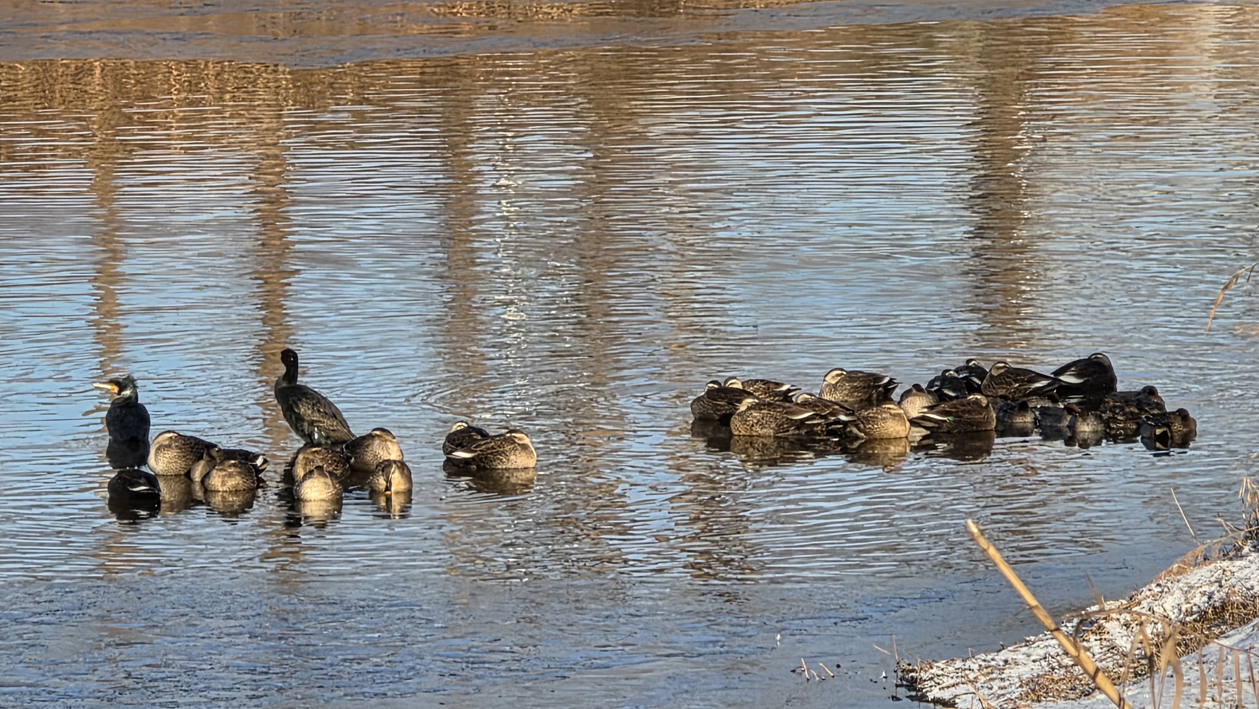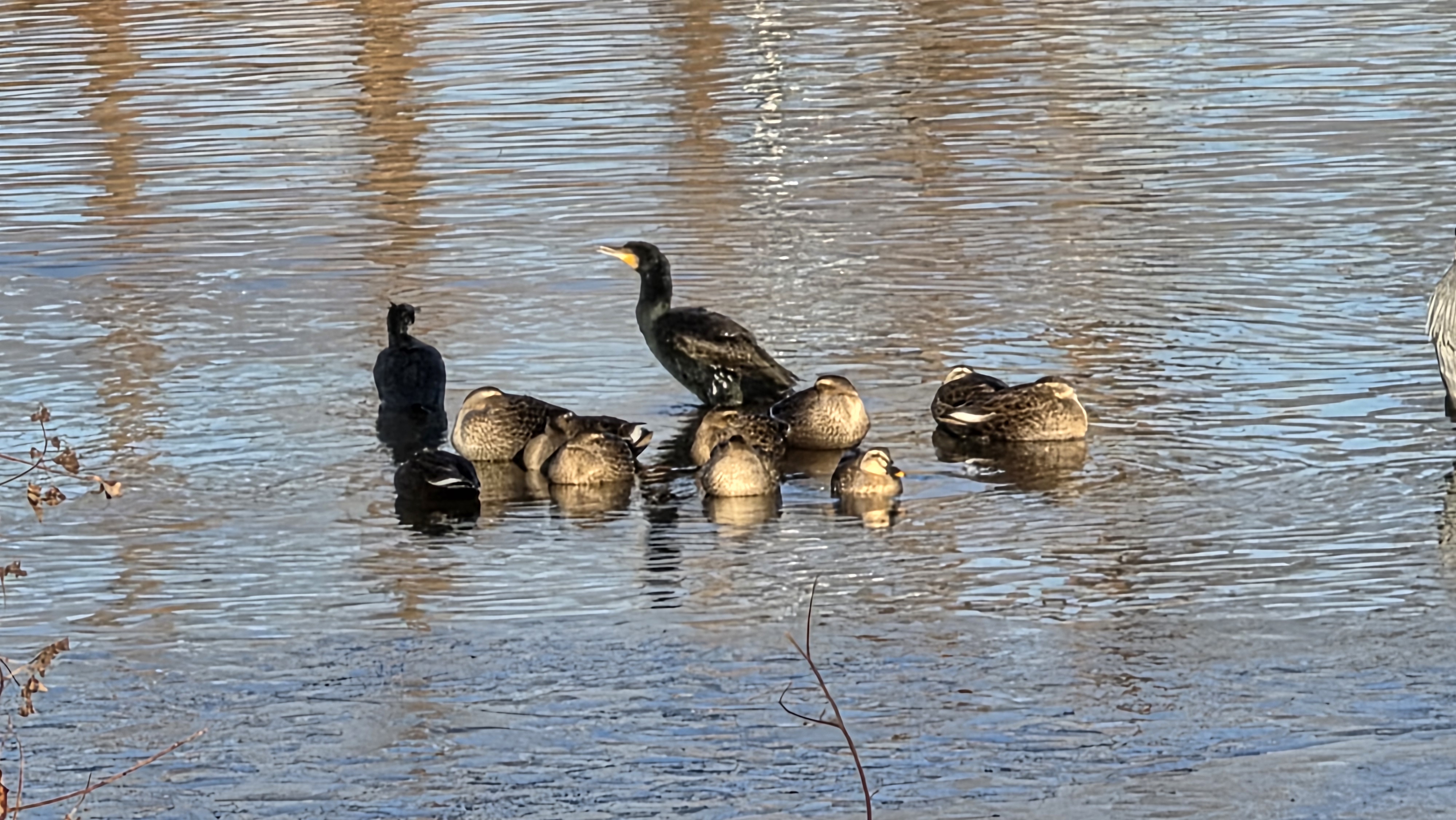 가마우지와 왜가리다. 이런 모습은 여기 정안천 냇물에서 드물게 보이는 모습이다.