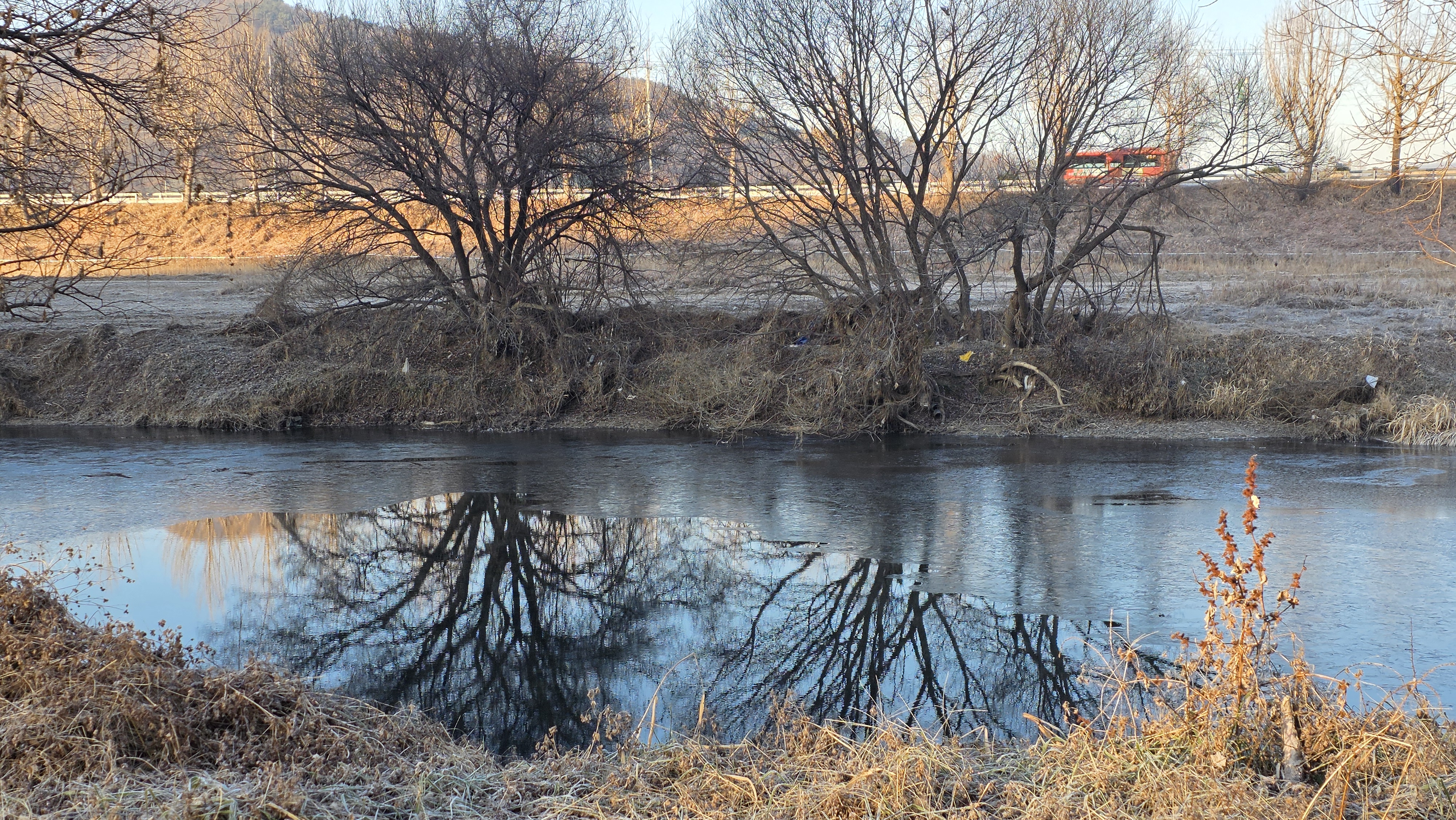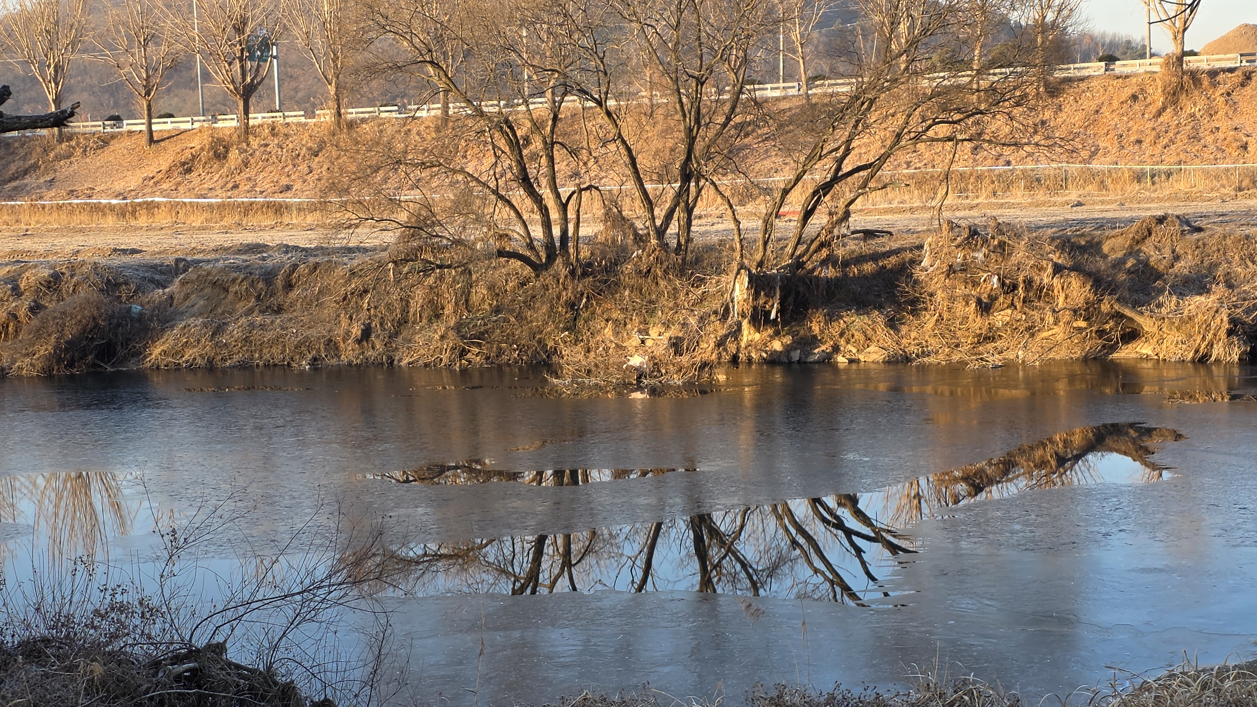 정안천 냇물이 얼어서 건너편 나무의 잔영이 이렇게 보인다.