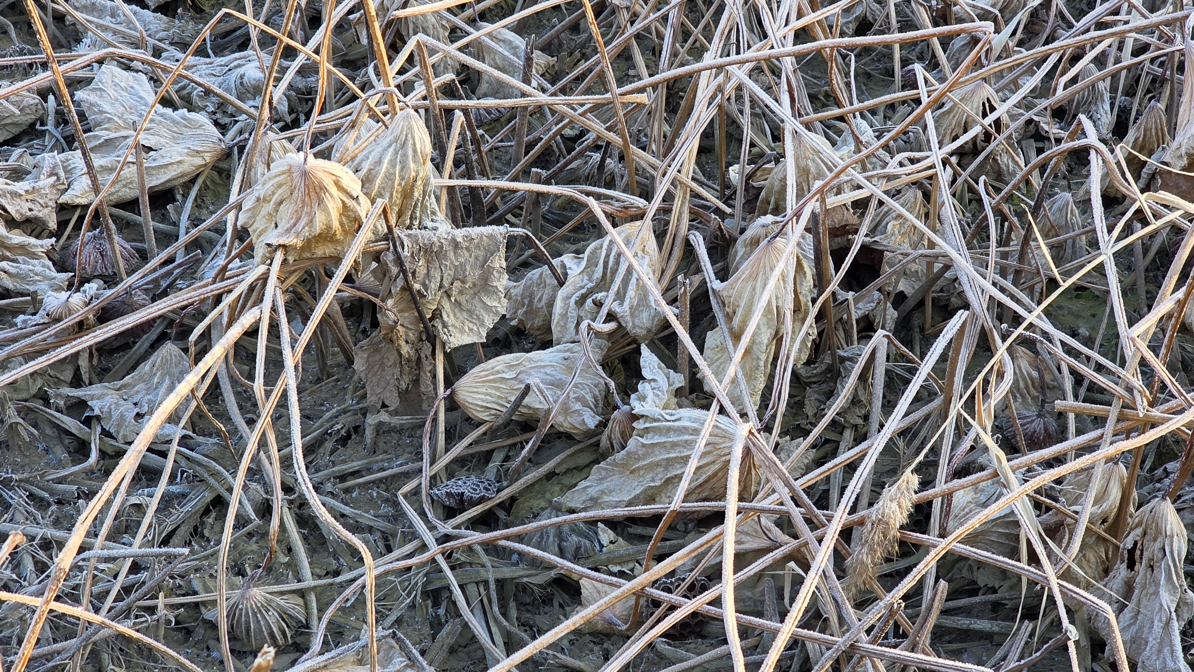 연못 물은 마르고 바닥에 얼어붙은 연꽃 잔해들이 꽁꽁 얼었다.