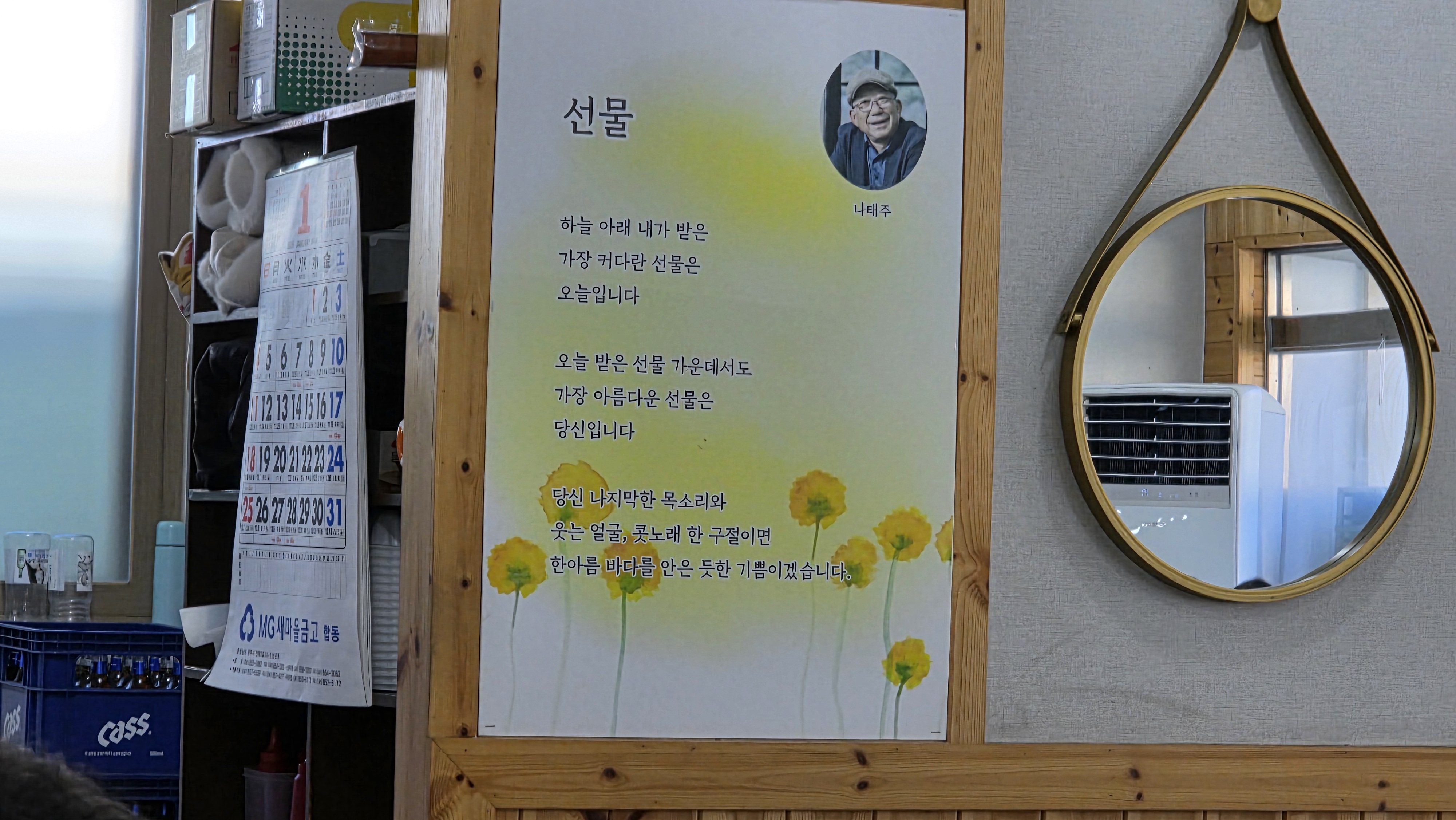 차 회장 기쁨으로 전주 콩나물국밥집에서 12명 회원이 점심을 즐겼다. 날달걀 하나 멋있는 콩나물 국밥 맛있었다. 먹으면서 보니 벽면에 나태주 시인 사진과 시 햔 편이 걸려 있다. 나태주는 유명 시인이다. 공주는 물론 충남을 벗어나 전국적으로 유명한 시인이다. 여기처럼 공주 웬만한 식당에서 나태주 시인을 쉽게 만날 수 있다.