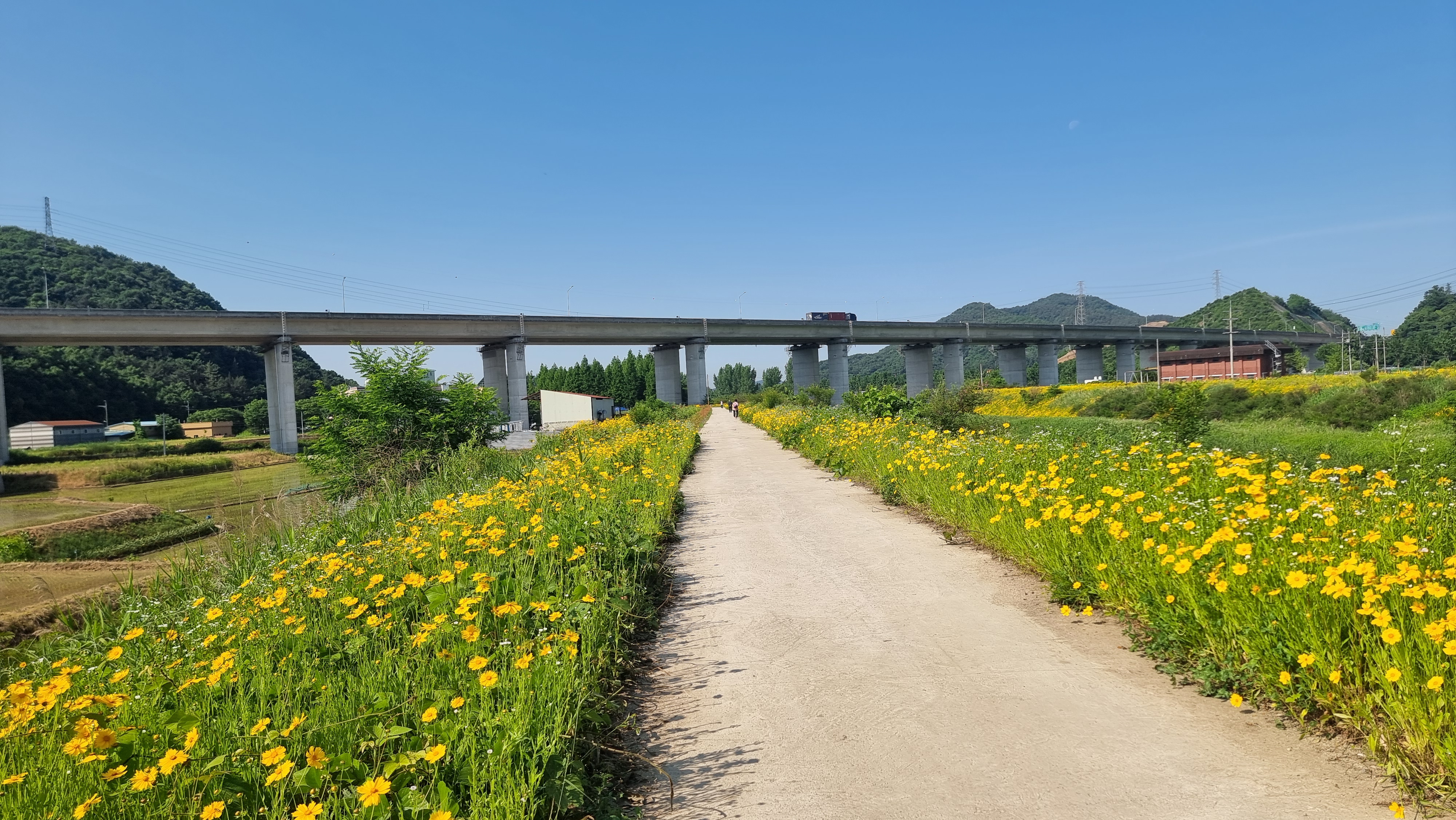 2024년 5월 29일, 수요일지금, 공주시 의당면 청룡리 둑, 꽃길에 금계국이 한창이다.노란 꽃이 둑길 양쪽에 줄지어 피어있는 걸 보면서 언젠가 이걸 심어 가꾼 사람들의 정성이 밴 것을 느낀다. 아무렇게나 내버려 둬도 잘 되는 것은 없다. 심을 때도 그렇고 풀을 뽑고 거름을 주고 하는 관심이 있어야 꽃을 피우는 것이다. '꽃 피워 열매 맺는다'는 말이 있듯이 좋은 조건을 만들어 주고 관심이 뒷받침되어야 열매를 맺을 수 있는 것이다.동혈천을 가운데 두고 양쪽에 죽 이어진 둑길에는 지금 노란 금계국이 여기를 걷는 사람들 마음을 환하게 하고 있다. 이 금계국은 한 번 씨를 뿌려 가꾸어 꽃을 피우면 이듬해 다시 싹이 나고 자라서 또 꽃을 피운다. 많은 금계국이 자란 곳은 잡초도 없다. 거름기가 적거나 너무 드..