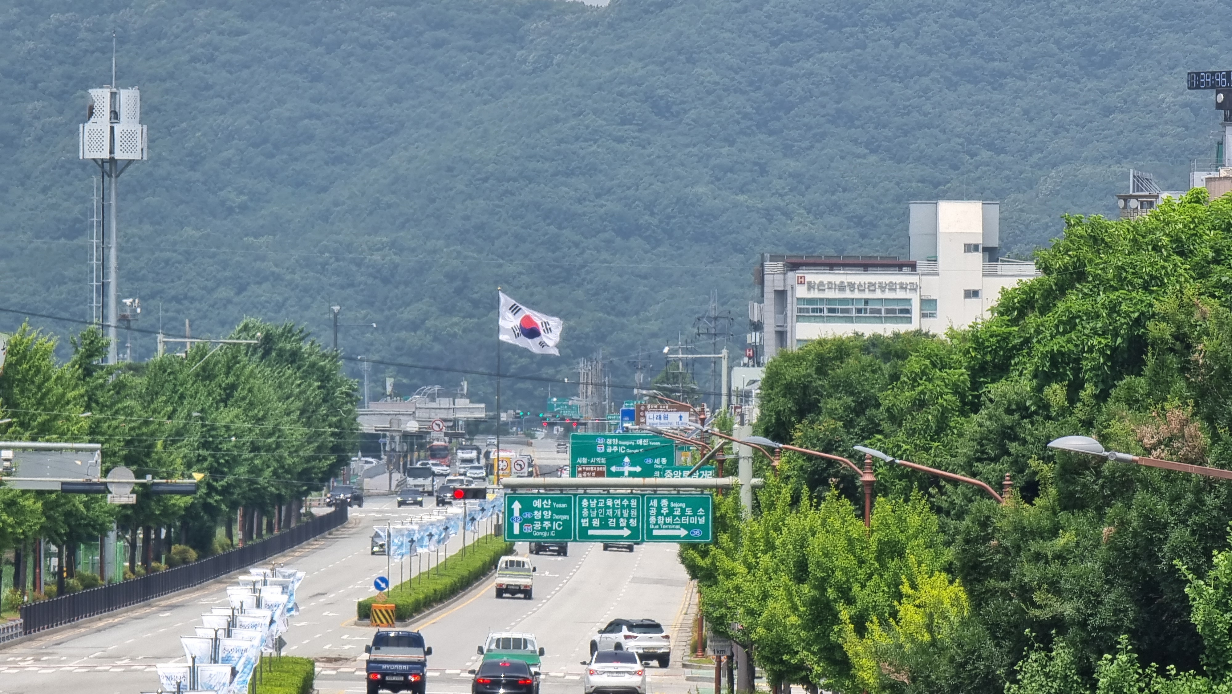2024년 6월 24일공주 신관육교 위에 있는 고마전망대에 올랐다.신관육교는 공주시 신관동 구터미널에서 도로를 건너 신관공원 쪽으로 놓인 통로로 얼마 전에 보수 작업을 마쳤는데 그 당시 고마전망대까지 만들어진 것이다. 신관육교는 전막 쪽에서 강북교차차로까지의 중간 부분에 놓인 육교로 육교의 중앙에 서서 좌우를 살피면 32번 국도를 오가는 자동차들의 행렬을 볼 수 있다.신관육교의 정면 가로막은 공주의 행사 알림판 역할을 한다. 오늘 보니 문예회관에서의 공연 프로그램이 걸려있다.도로의 중앙분리대에는 박동진 명고 명창 대회 안내 깃발이 휘날리며 전막 쪽 대형 태극기가 바람에 펄럭이는 모습이다.고마전망대에서 보이는 주변 경관이 아름답다. 멋진 공주 모습이다.